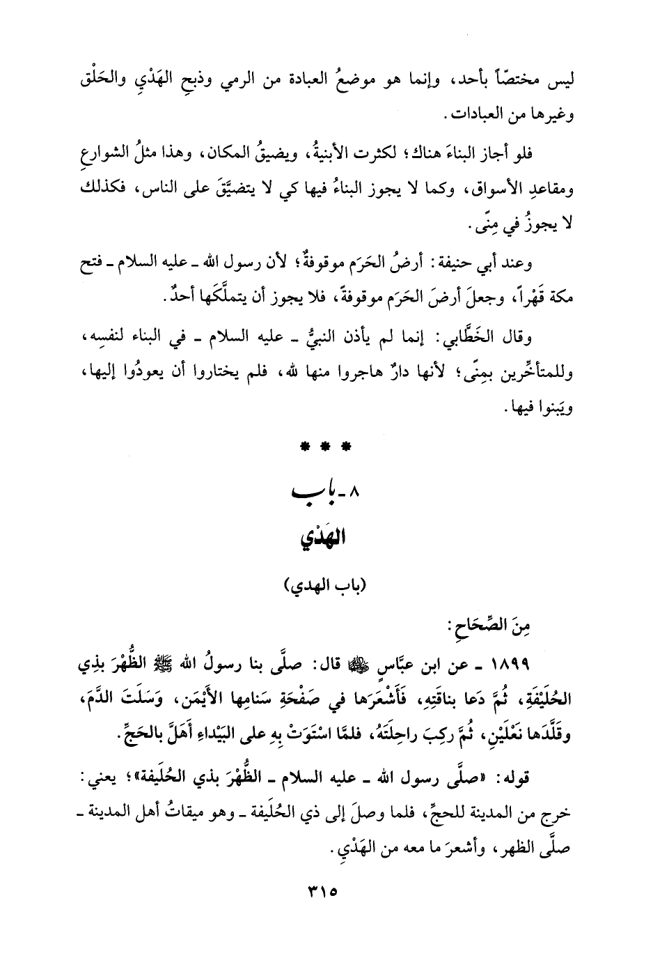 1899 - عن ابن عبَّاسٍ - رضي الله عنهما - قال: صلَّى بنا رسولُ الله - صلى الله عليه وسلم - الظُّهْرَ بذِي الحُلَيْفَةِ، ثُمَّ دَعا بناقَتِهِ، فَأَشْعَرَها في صَفْحَةِ سَنامِها الأَيْمَن، وَسَلَتَ الدَّمَ، وقَلَّدَها نَعْلَيْنِ، ثُمَّ ركِبَ راحِلَتَهُ، فلمَّا اسْتَوَتْ بِهِ على البَيْداءِ أَهَلَّ بالحَجِّ.