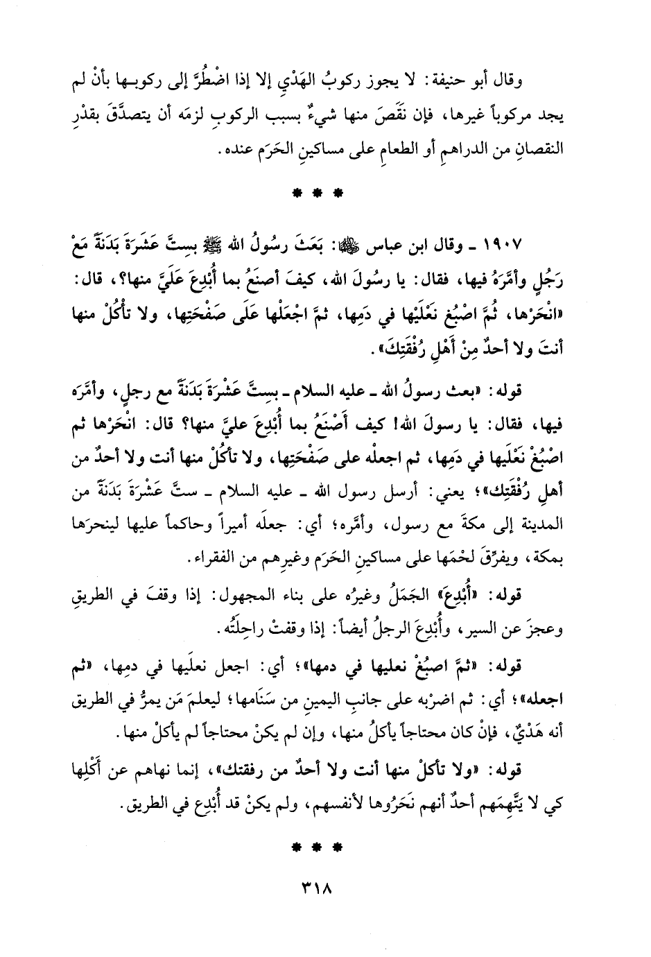 1907 - وقال ابن عباس - رضي الله عنهما -: بَعَثَ رسُولُ الله - صلى الله عليه وسلم - بسِتَّ عَشَرَةَ بَدَنَةً مَعْ رَجُلٍ وأمَّرَهُ فيها، فقال: يا رسُولَ الله، كيفَ أصنعُ بما أُبْدِعَ عَلَيَّ منها؟، قال: "انْحَرْها، ثُمَّ اصْبُغ نَعْلَيْها في دَمِها، ثمَّ اجْعَلْها عَلَى صَفْحَتِها، ولا تأْكُلْ منها أنتَ ولا أحدٌ مِنْ أَهْلِ رُفْقَتِكَ".