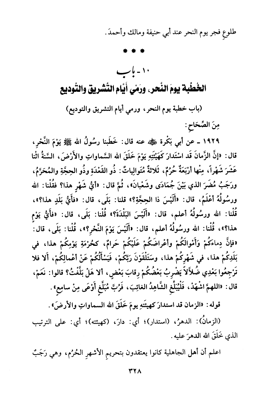 1929 - عن أبي بَكْرة - رضي الله عنه - عنه قال: خَطَبنا رسُولُ الله - صلى الله عليه وسلم - يَوْمَ النَّحْرِ، قال: "إنَّ الزَّمانَ قَد اسْتَدارَ كَهَيْئَتِهِ يَوْمَ خَلَقَ الله السَّماواتِ والأَرْضَ، السَّنةُ اثْنا عَشَرَ شَهْرًا، مِنْها أرْبَعَةٌ حُرُمٌ، ثَلاثةٌ مُتَوالِياتٌ: ذُو القَعْدَةِ وذُو الحِجَّةِ والمُحَرَّمُ، ورَجَبُ مُضَرَ الذي بَيْنَ جُمَادَى وشَعْبانَ"، ثُمَّ قال: "أيُّ شَهْرٍ هذا؟ فقُلْنا: الله ورسُولُهُ أعْلَمُ، قال: "ألَيْسَ ذا الحِجَّةِ؟ " قلنا: بَلَى، قال: "فأَيُّ بَلَدٍ هذا؟ "، قُلْنا: الله ورسُولُهُ أعلم، قال: "أَلَيْسَ البَلْدَةَ؟ " قُلْنا: بَلَى، قال: "فأَيُّ يَوْمٍ هذا؟ "، قُلْنا: الله ورسُولُهُ أعلم، قال: "ألَيْسَ يَوْمَ النَّحْرِ؟ "، قُلْنا: بَلَى، قال: "فإنَّ دِماءَكُمْ وَأَمْوالَكُمْ وأعْراضَكُمْ عَلَيْكُمْ حَرامٌ، كحُرْمَةِ يَوْمِكُمْ هذا، في بَلَدِكُمْ هذا، في شَهْرِكُمْ هذا، وسَتَلْقَوْنَ رَبَّكُمْ، فَيَسْأَلُكُمْ عَنْ أعْمالِكُمْ، أَلا فلا تَرْجِعُوا بَعْدِي ضُلاَّلاً يَضْرِبُ بَعْضُكُمْ رِقابَ بَعْضٍ، ألا هَلْ بَلَّغْتُ؟ قالوا: نَعَمْ، قال: "اللهمَّ اشْهّدْ، فَلْيُبَلِّغِ الشَّاهِدُ الغائِبَ، فَرُبَّ مُبَلَّغٍ أَوْعَى مِنْ سامِعٍ".