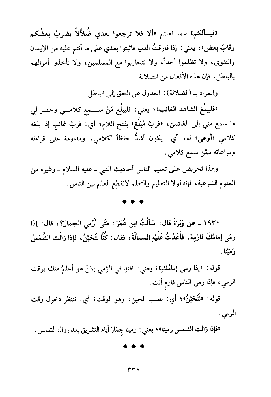 1930 - عن وَبَرَةَ قال: سَألْتُ ابن عُمَرَ: مَتَى أَرْمي الجمارَ؟، قال: إذا رمَى إمامُكَ فارْمِهْ، فأَعَدْتُ عَلَيْهِ المسألَةَ، فقال: كُنَّا نتَحَيَّنُ، فإذا زالَت الشَّمْسُ رَمَيْنا.