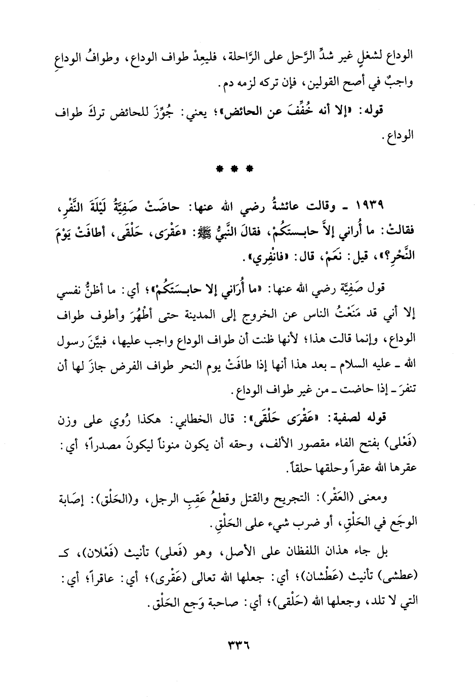 1939 - وقالت عائشةُ رضي الله عنها: حاضَتْ صَفِيَّةُ لَيْلَةَ النَّفْرِ، فقالتْ: ما أُراني إلاَّ حابستَكُمْ, فقالَ النَّبيُّ - صلى الله عليه وسلم -: "عَقْرَى، حَلْقَى، أطافَتْ يَوْمَ النَّحْرِ؟ "، قيل: نَعَمْ، قال: "فانْفِري".
