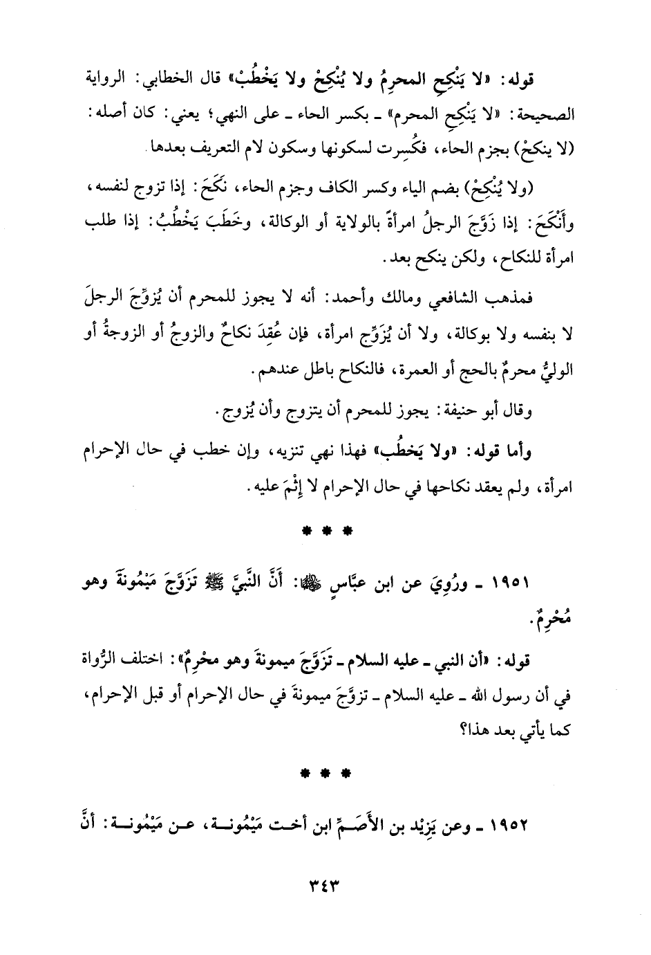 1951 - ورُوِيَ عن ابن عبَّاسٍ - رضي الله عنهما -: أَنَّ النَّبيَّ - صلى الله عليه وسلم - تَزَوَّجَ مَيْمُونَةَ وهو مُحْرِمٌ.