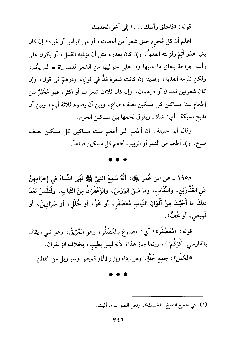 1958 - عن ابن عُمر - رضي الله عنهما -: أنَّهُ سَمِعَ النبيَّ - صلى الله عليه وسلم - نَهَى النِّساءَ في إِحْرَامِهِنَّ عَنِ القُفَّازَيْنِ، والنِّقَابِ، وما مَسَّ الوَرْسُ، والزَّعْفَرَانُ مِنَ الثِّيابِ، ولْتَلْبَسْ بَعْدَ ذلكَ ما أَحَبَّتْ مِنْ ألْوَانِ الثِّيابِ مُعَصْفَرٍ، أو خَزًّ، أو حُلَلٍ، أو سَرَاوِيلَ، أو قَمِيصٍ، أو خُفٍّ".