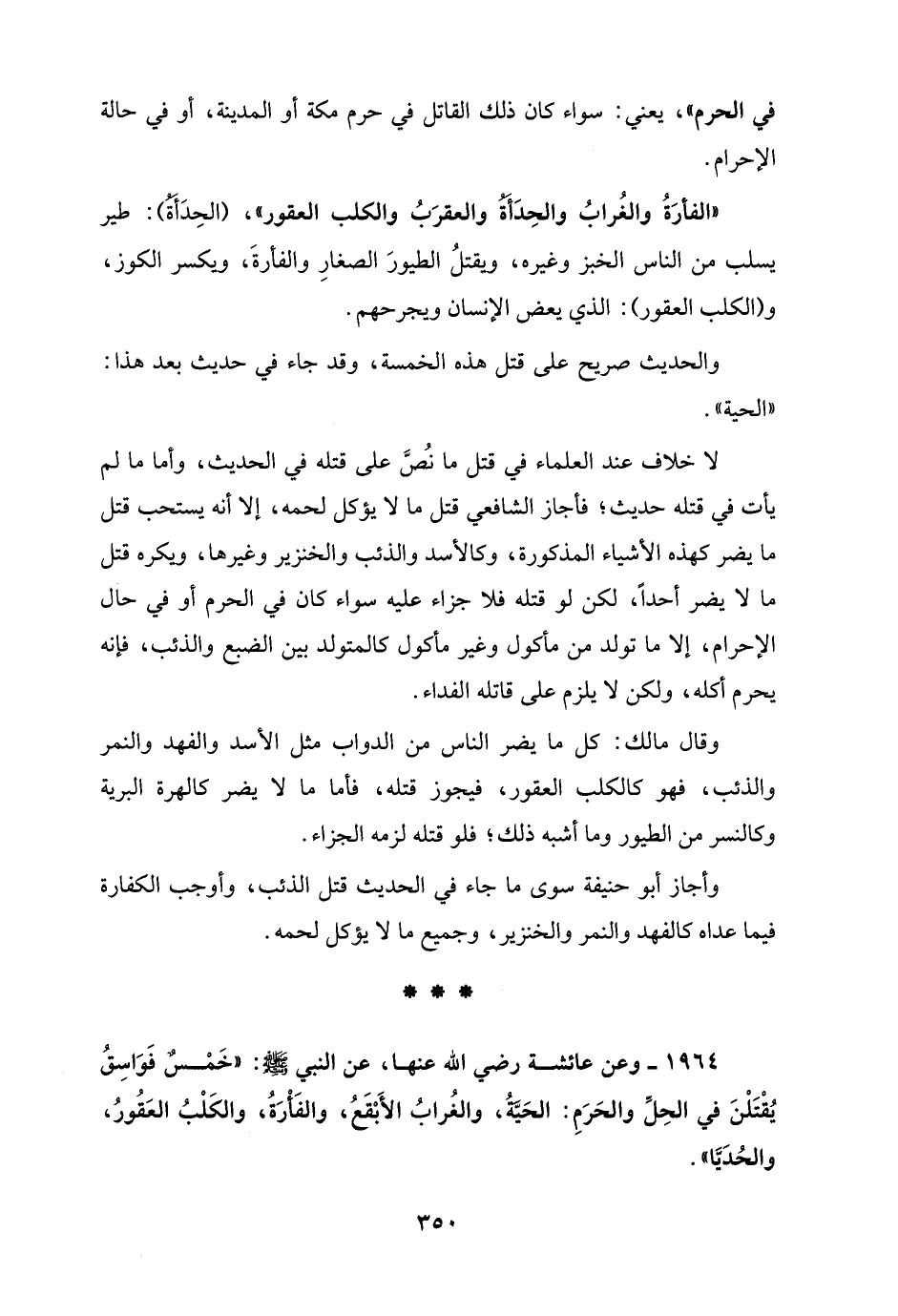 1964 - وعن عائشة رضي الله عنها، عن النبي - صلى الله عليه وسلم -: "خَمْسٌ فَوَاسِقُ يُقْتَلْنَ في الحِلِّ والحَرَمِ: الحَيَّةُ، والغُرابُ الأَبْقَعُ، والفَأرَةُ، والكَلْبُ العَقُورُ، والحُدَيَّا".