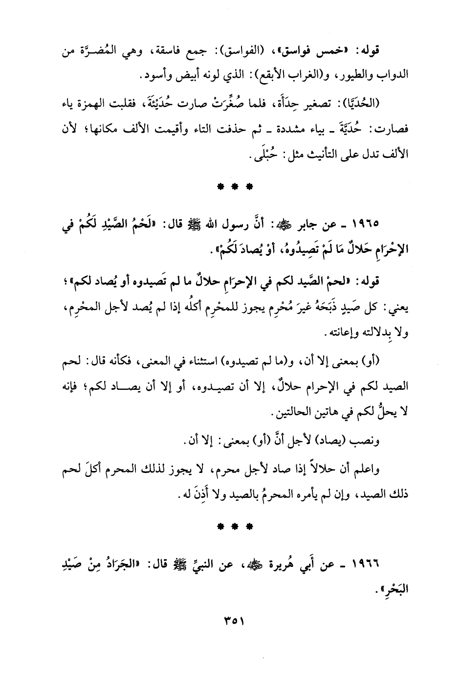 1965 - عن جابر - رضي الله عنه -: أنَّ رسول الله - صلى الله عليه وسلم - قال: "لَحْمُ الصَّيْدِ لَكُمْ في الإِحْرَامِ حَلالٌ مَا لَمْ تَصِيدُوهُ، أوْ يُصادَ لَكُمْ".