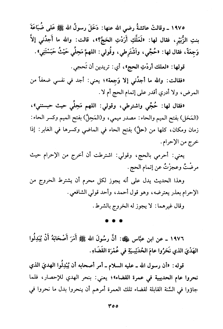 1975 - وقالتْ عائشةُ رضي الله عنها: دَخَلَ رسولُ الله - صلى الله عليه وسلم - عَلى ضُبَاعَةَ بنتِ الزُّبَيْرِ، فقال لها: "لَعَلَّكِ أَرَدْتِ الحَجَّ؟ "، قالت: والله ما أَجدُني إلاَّ وَجِعَةً، فقال لها: "حُجِّي، واَشْتَرِطي، وقُولي: اللهمَّ مَحِلِّي حَيْثُ حَبَسْتَنِي".