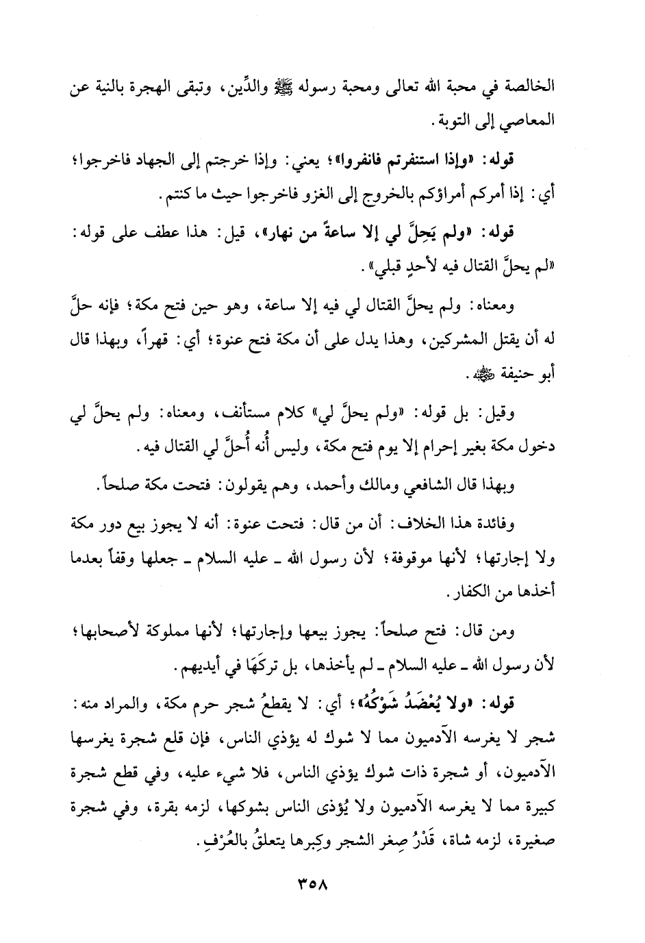 ومعناه: ولم يحلَّ القتال لي فيه إلا ساعة، وهو حين فتح مكة؛ فإنه حلَّ له أن يقتل المشركين، وهذا يدل على أن مكة فتح عنوة؛ أي: قهرًا، وبهذا قال أبو حنيفة - رضي الله عنه -.