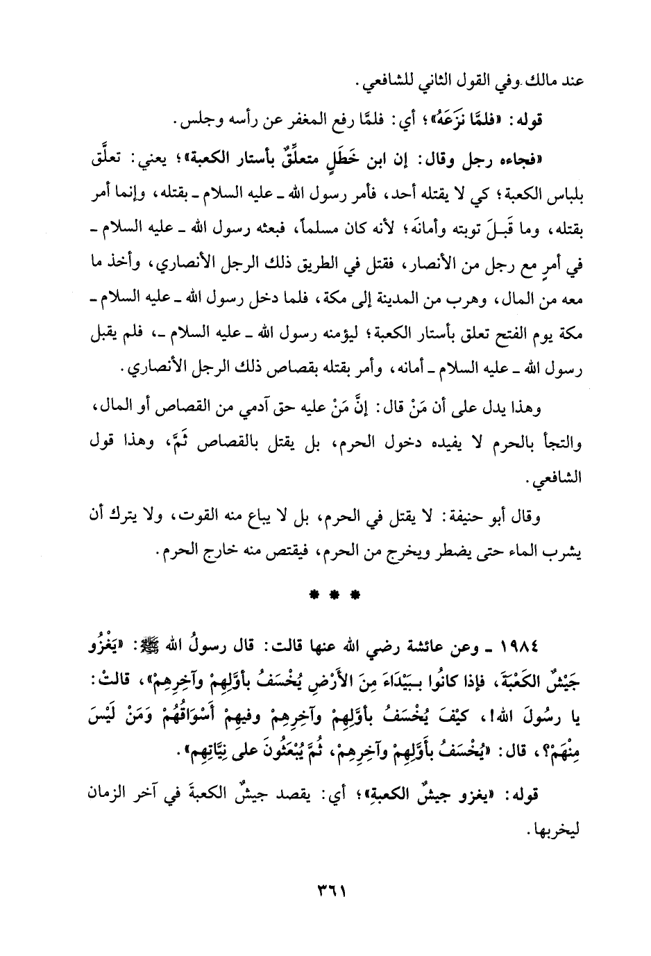 وهذا يدل على أن مَنْ قال: إنَّ مَنْ عليه حق آدمي من القصاص أو المال، والتجأ بالحرم لا يفيده دخول الحرم، بل يقتل بالقصاص ثَمَّ، وهذا قول الشافعي.