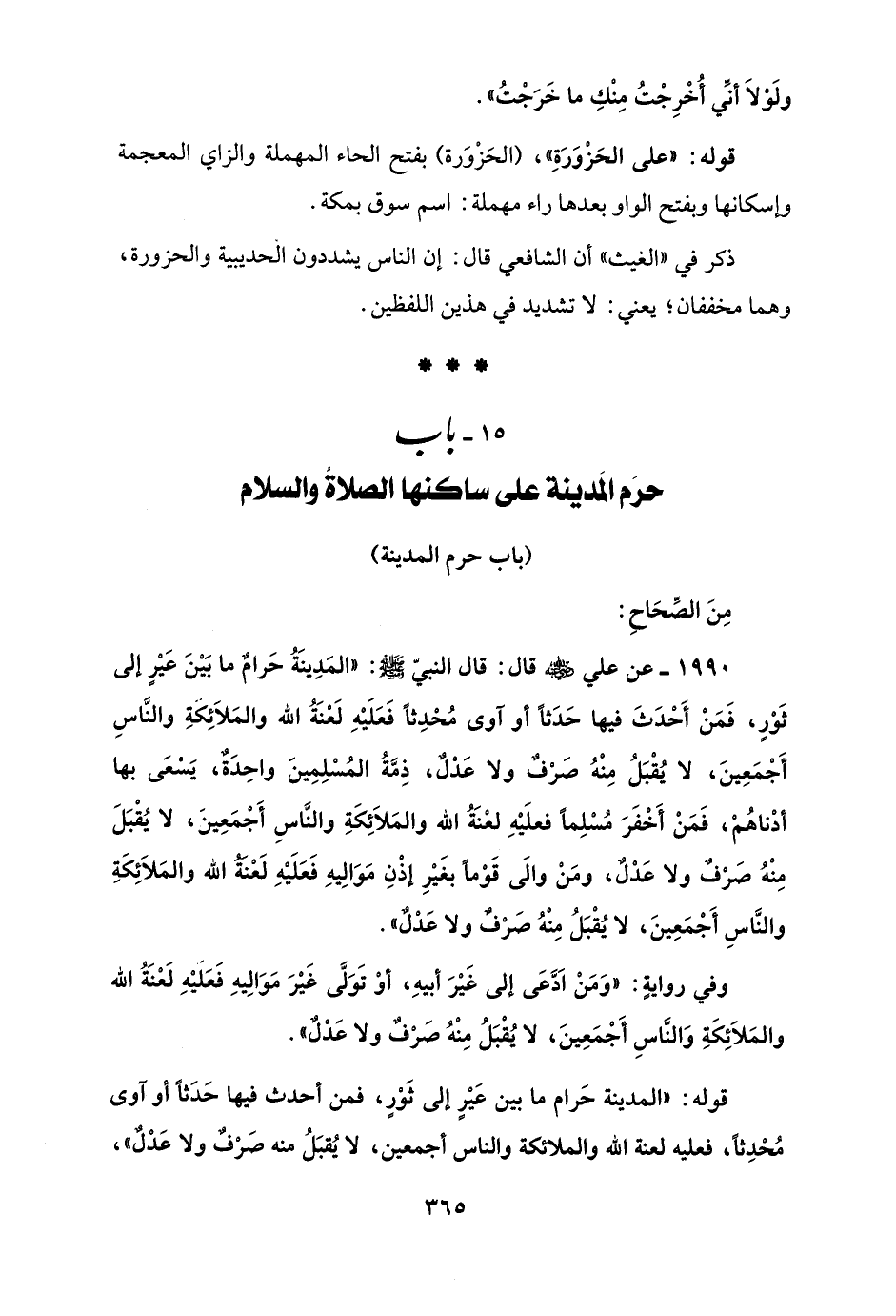 1990 - عن علي - رضي الله عنه - قال: قال النبيّ - صلى الله عليه وسلم -: "المَدِينَةُ حَرامٌ ما بَيْنَ عَيْرٍ إلى ثَوْرٍ، فَمَنْ أَحْدَثَ فيها حَدَثًا أو آوى مُحْدِثًا فَعَلَيْهِ لَعْنَةُ الله والمَلاَئِكَةِ والنَّاسِ أَجْمَعِينَ، لا يُقْبَلُ مِنْهُ صَرْفٌ ولا عَدْلٌ، ذِمَّةُ المُسْلِمِينَ واحِدَةٌ، يَسْعَى بها أدْناهُمْ، فَمَنْ أَخْفَرَ مُسْلِمًا فعلَيْهِ لعْنَةُ الله والمَلاَئِكَةِ والنَّاسِ أَجْمَعِينَ، لا يُقْبَلَ مِنْهُ صَرْفٌ ولا عَدْلٌ، ومَنْ والَى قَوْمًا بغَيْرِ إذْنِ مَوَالِيهِ فَعَلَيْهِ لَعْنَةُ الله والمَلاَئِكَةِ والنَّاسِ أَجْمَعِينَ، لا يُقْبَلُ مِنْهُ صَرْفٌ ولا عَدْلٌ".