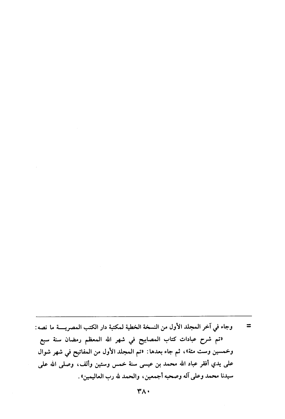"تم شرح عبادات كتاب المصابيح في شهر الله المعظم رمضان سنة سبع وخمسين وست مئة"، ثم جاء بعدها: "تم المجلد الأول من المفاتيح في شهر شوال على يدي أفقر عباد الله محمد بن عيسى سنة خمس وستين وألف، وصلى الله على سيدنا محمد وعلى آله وصحبه أجمعين، والحمد لله رب العالمين".