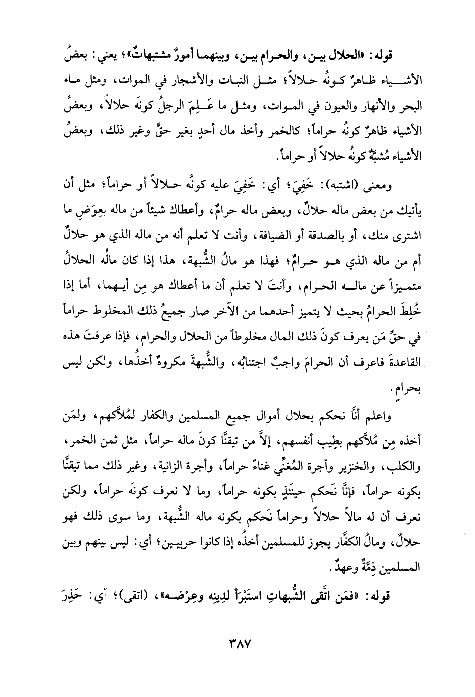 ومعنى (اشتبه): خَفِيَ؛ أي: خَفِيَ عليه كونُه حلالًا أو حرامًا؛ مثل أن يأتيك من بعض ماله حلالٌ، وبعض ماله حرامٌ، وأعطاك شيئًا من ماله بعِوَضِ ما اشترى منك، أو بالصدقة أو الضيافة، وأنت لا تعلم أنه من ماله الذي هو حلالٌ أم من ماله الذي هو حرامٌ؛ فهذا هو مالُ الشُّبهة، هذا إذا كان مالُه الحلالُ متميزًا عن ماله الحرام، وأنتَ لا تعلم أن ما أعطاك هو مِن أيهما، أما إذا خُلِطَ الحرامُ بحيث لا يتميز أحدهما من الآخر صار جميعُ ذلك المخلوط حرامًا في حقِّ مَن يعرف كونَ ذلك المال مخلوطًا من الحلال والحرام، فإذا عرفتَ هذه القاعدةَ فاعرف أن الحرامَ واجبٌ اجتنابُه، والشُّبهةَ مكروهٌ أخذُها، ولكن ليس بحرامٍ.