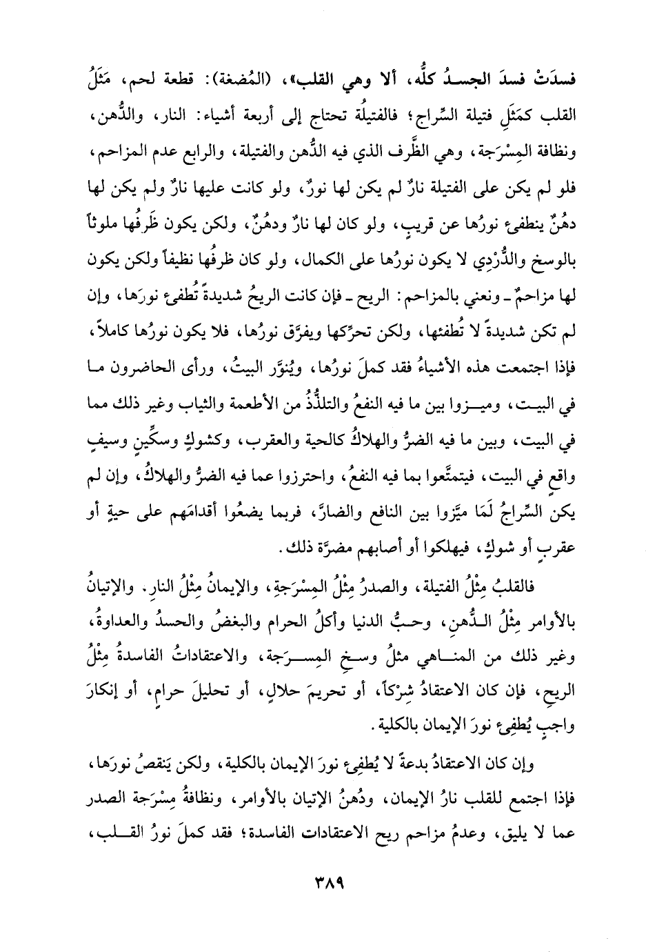 فسدَتْ فسدَ الجسدُ كلُّه، ألا وهي القلب"، (المُضغة): قطعة لحم، مَثَلُ القلب كمَثَلِ فتيلة السِّراج؛ فالفتيلة تحتاج إلى أربعة أشياء: النار، والدُّهن، ونظافة المِسْرَجة، وهي الظَّرف الذي فيه الدُّهن والفتيلة، والرابع عدم المزاحم، فلو لم يكن على الفتيلة نارٌ لم يكن لها نورٌ، ولو كانت عليها نارٌ ولم يكن لها دهُنٌ ينطفئ نورُها عن قريبٍ، ولو كان لها نارٌ ودهُنٌ، ولكن يكون ظَرفُها ملوثًا بالوسخ والدُّرْدِي لا يكون نورُها على الكمال، ولو كان ظرفُها نظيفًا ولكن يكون لها مزاحمٌ - ونعني بالمزاحم: الريح - فإن كانت الريحُ شديدةً تُطفئ نورَها، وإن لم تكن شديدةً لا تُطفئها، ولكن تحرِّكها ويفرَّق نورُها، فلا يكون نورُها كاملًا، فإذا اجتمعت هذه الأشياءُ فقد كملَ نورُها، ويُنوَّر البيتُ، ورأى الحاضرون ما في البيت، وميزوا بين ما فيه النفعُ والتلذُّذُ من الأطعمة والثياب وغير ذلك مما في البيت، وبين ما فيه الضرُّ والهلاكُ كالحية والعقرب، وكشوكٍ وسكِّينٍ وسيفٍ واقعٍ في البيت، فيتمتَّعوا بما فيه النفعُ، واحترزوا عما فيه الضرُّ والهلاكُ، وإن لم يكن السِّراجُ لَمَا ميَّزوا بين النافع والضارَّ، فربما يضعُوا أقدامَهم على حيةٍ أو عقربٍ أو شوكٍ، فيهلكوا أو أصابهم مضرَّة ذلك.