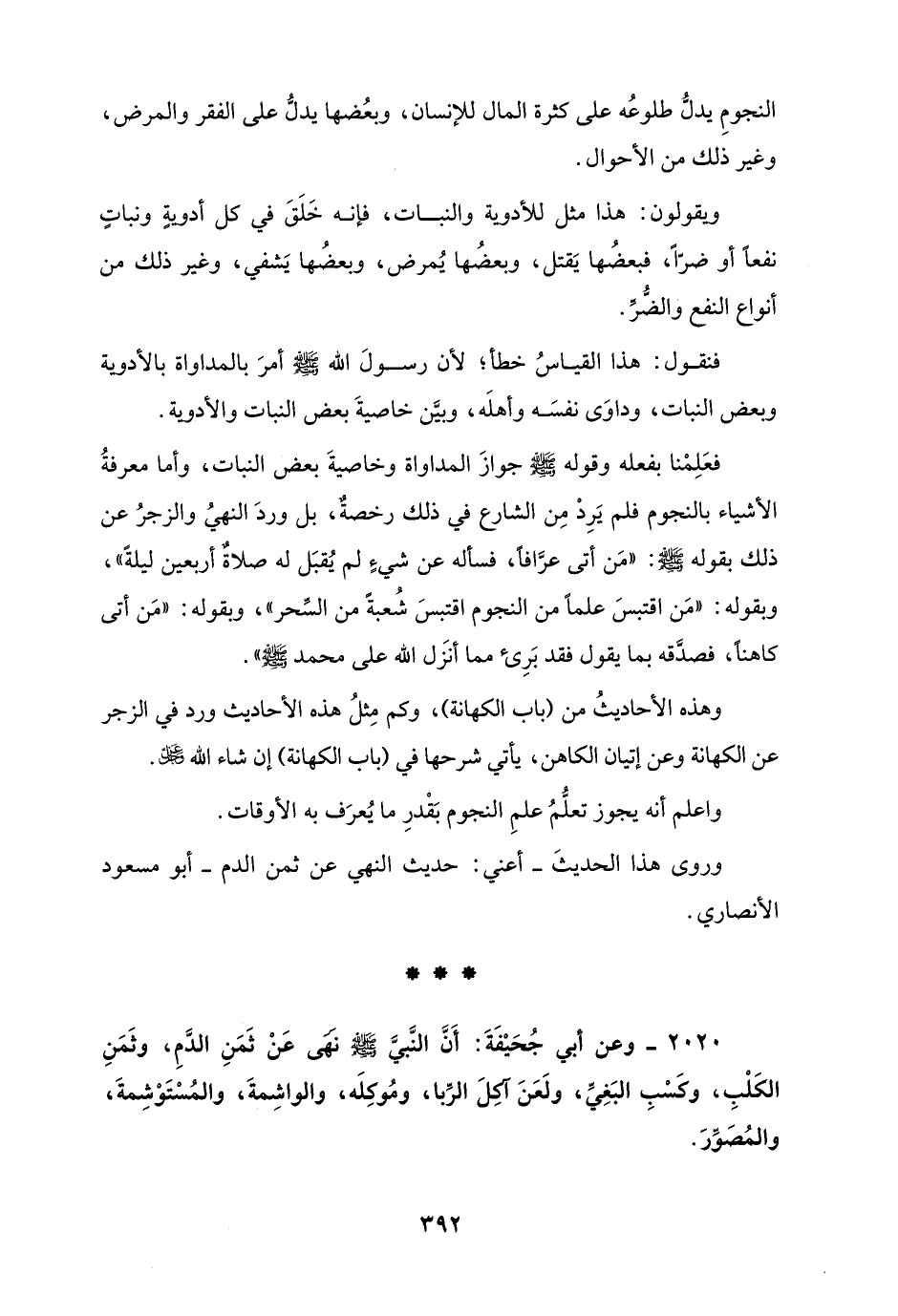 فعَلِمْنا بفعله وقوله - صلي الله عليه وسلم - جوازَ المداواة وخاصيةَ بعض النبات، وأما معرفةُ الأشياء بالنجوم فلم يَرِدْ مِن الشارع في ذلك رخصةٌ، بل وردَ النهيُ والزجرُ عن ذلك بقوله - صلى الله عليه وسلم -: "مَن أتى عرَّافًا، فسأله عن شيءٍ لم يُقبَل له صلاةٌ أربعين ليلةً"، وبقوله: "مَن اقتبسَ علمًا من النجوم اقتبسَ شُعبةً من السِّحر"، وبقوله: "مَن أتى كاهنًا، فصدَّقه بما يقول فقد بَرِئ مما أنزَل الله على محمد - صلى الله عليه وسلم -".