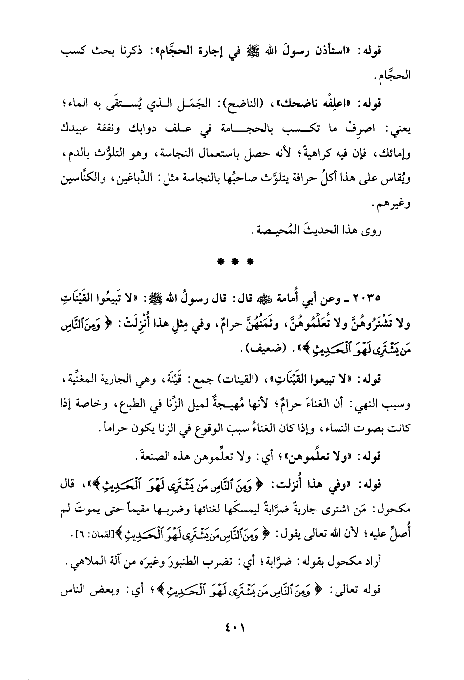 2035 - وعن أبي أُمامة - رضي الله عنه - قال: قال رسولُ الله - صلى الله عليه وسلم -: "لا تَبيعُوا القَيْنَاتِ ولا تَشْتَرُوهُنَّ ولا تُعَلِّمُوهُنَّ، وثَمَنُهُنَّ حرامٌ، وفي مِثلِ هذا أُنْزِلَتْ: {وَمِنَ النَّاسِ مَنْ يَشْتَرِي لَهْوَ الْحَدِيثِ} ". (ضعيف).
