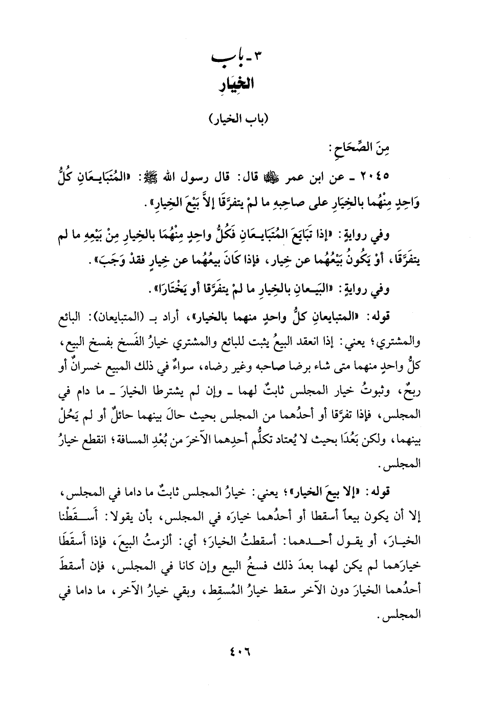 2045 - عن ابن عمر - رضي الله عنهما - قال: قال رسول الله - صلى الله عليه وسلم -: "المُتَبَايعَانِ كُلُّ وَاحِدٍ مِنْهُما بالخِيَارِ على صاحِبهِ ما لمْ يتفرَّقَا إلَّا بَيْعَ الخِيارِ".