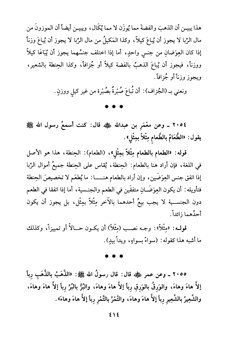 2055 - وعن عمر - رضي الله عنه - قال: قال رسولُ الله - صلى الله عليه وسلم -: "الذَّهَبُ بالذَّهَبِ رِبًا إلَّا هاءَ وهاءَ والوَرِقُ بالوَرِقِ رِبًا إلَّا هاءَ وهاءَ، والبُرُّ بالبُرِّ رِبًا إلَّا هاءَ وهاءَ، والشَّعِيرُ بالشَّعِيرِ رِبًا إلَّا هاءَ وهاءَ, والتَّمْرُ بالتَّمْرِ رِبًا إلَّا هاءَ وهاءَ".