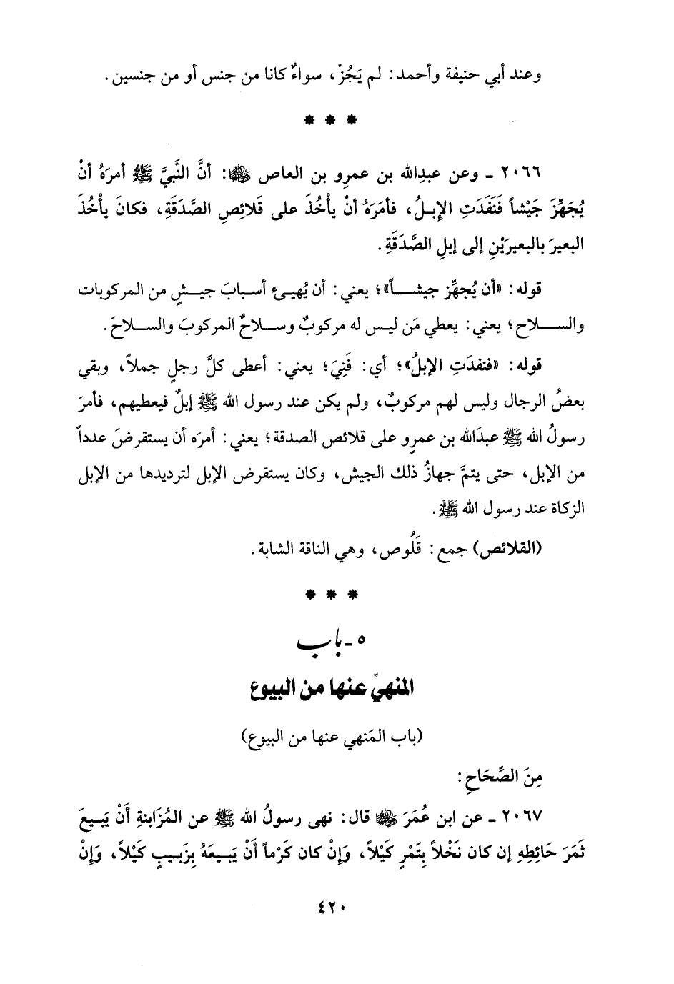 2066 - وعن عبدِ الله بن عمرِو بن العاص - رضي الله عنهما -: أنَّ النَّبيَّ - صلى الله عليه وسلم - أمرَهُ أنْ يُجَهِّزَ جَيْشًا فَنَفَدَتِ الإِبلُ، فأمَرَهُ أنْ يأْخُذَ على قَلائِصِ الصَّدَقَةِ، فكانَ يأْخُذَ البعيرَ بالبعيرَيْنِ إلى إبلِ الصَّدَقَةِ.