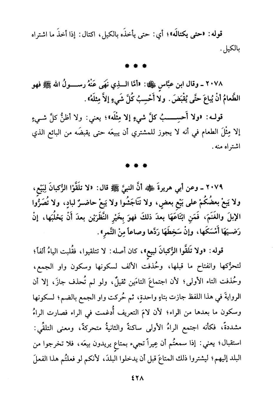 2079 - وعن أبي هريرةَ - رضي الله عنه - أنَّ النبيَّ - صلى الله عليه وسلم - قال: "لا تلَقَوْا الرُّكبانَ لِبَيْعٍ، ولا يَبعْ بعضُكُمْ على بَيْعِ بعضٍ، ولا تناجَشُوا ولا يَبعْ حاضرٌ لبادٍ، ولا تُصَرُّوا الإبلَ والغَنَمَ، فَمَنِ ابْتَاعَهَا بعدَ ذلكَ فهوَ بِخَيْرِ النَّظَرَيْن بعدَ أَنْ يَحْلُبَها، إنْ رَضيَهَا أَمْسَكَها، وإنْ سَخِطَهَا رَدَّها وصاعًا مِنْ التَّمرِ".