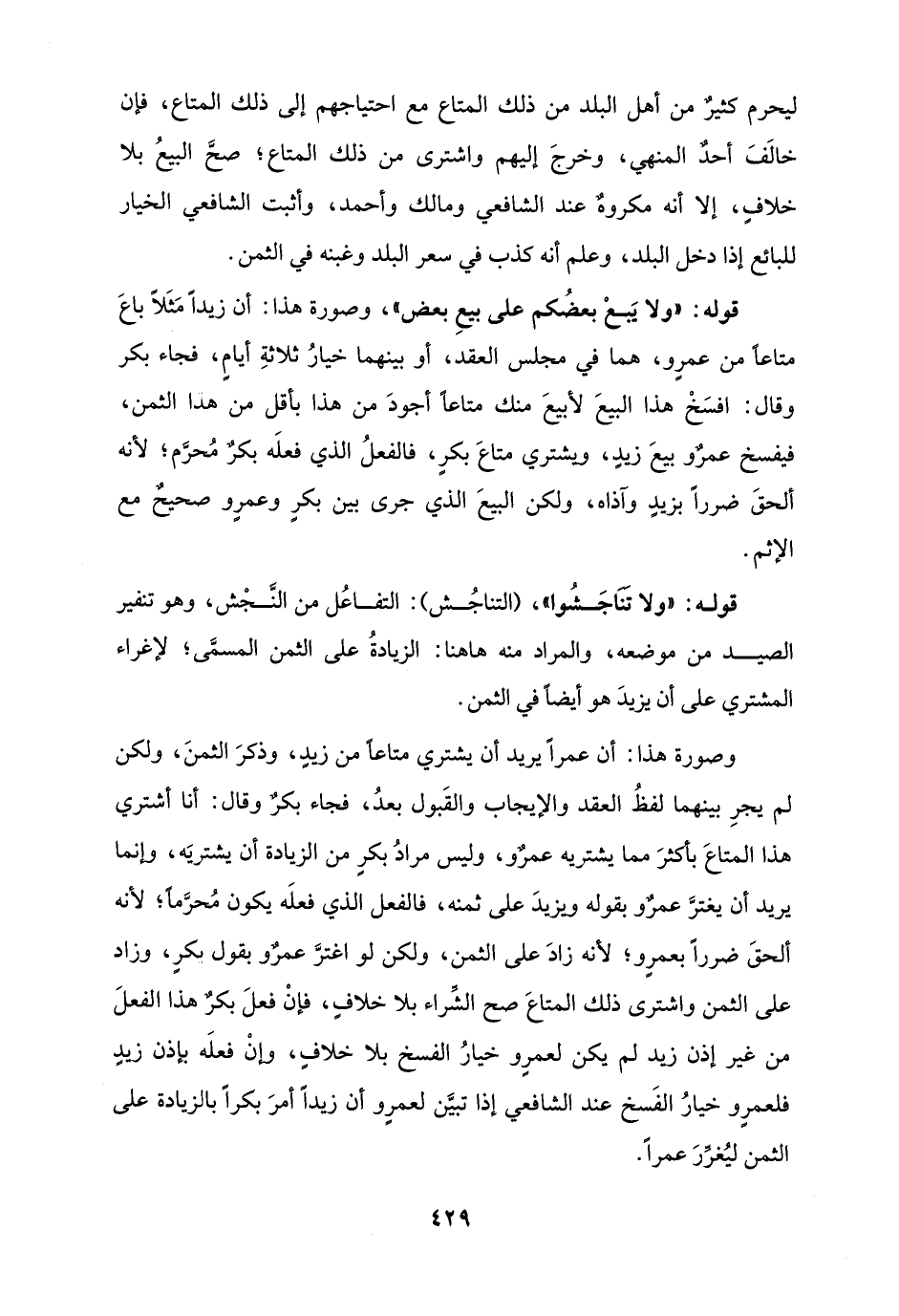 وصورة هذا: أن عمرًا يريد أن يشتري متاعًا من زيدٍ، وذكرَ الثمنَ، ولكن لم يجرِ بينهما لفظُ العقد والإيجاب والقَبول بعدُ، فجاء بكرٌ وقال: أنا أشتري هذا المتاعَ بأكثرَ مما يشتريه عمرٌو، وليس مرادُ بكرِ من الزيادة أن يشتريَه، وإنما يريد أن يغترَّ عمرٌو بقوله ويزيدَ على ثمنه، فالفعل الذي فعلَه يكون مُحرَّمًا؛ لأنه ألحقَ ضررًا بعمرٍو؛ لأنه زادَ على الثمن، ولكن لو اغترَّ عمرٌو بقول بكرٍ، وزاد على الثمن واشترى ذلك المتاعَ صح الشِّراء بلا خلافٍ، فإنْ فعلَ بكرٌ هذا الفعلَ من غير إذن زيد لم يكن لعمرٍو خيارُ الفسخ بلا خلافٍ، وإنْ فعلَه بإذن زيدٍ فلعمرٍو خيارُ الفَسخ عند الشافعي إذا تبيَّن لعمرٍو أن زيدًا أمرَ بكرًا بالزيادة على الثمن ليُغرِّرَ عمرًا.