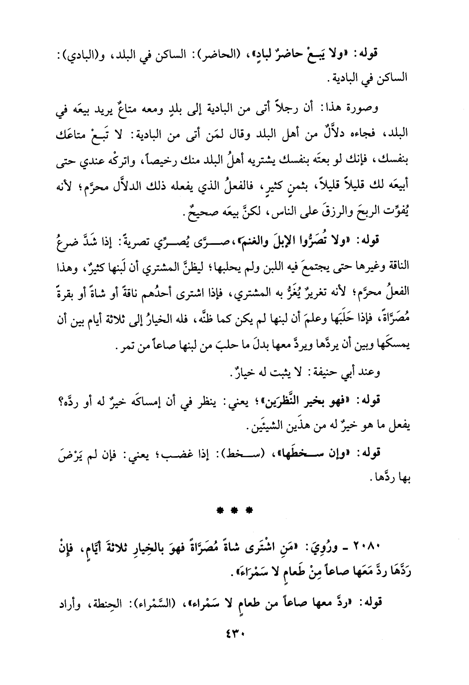 2080 - ورُوِيَ: "مَنِ اشْتَرى شاةً مُصَرَّاةً فهوَ بالخِيارِ ثلاثةَ أيَّامٍ، فإِنْ رَدَّهَا ردَّ مَعَها صاعًا مِنْ طَعامٍ لا سَمْرَاءَ".