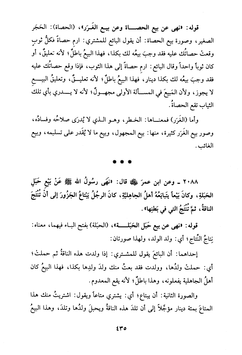 2088 - وعن ابن عمرَ - رضي الله عنهما - قال: "نَهَى رسُولُ الله - صلى الله عليه وسلم - عَنْ بَيْعِ حَبَلِ الحَبَلةِ، وكانَ بَيْعًا يتَبايَعُهُ أهلُ الجاهِليَّةِ، كانَ الرجُلُ يَبْتاعُ الجَزُورَ إلى أنْ تُنْتَجَ الناقةُ، ثمَّ تُنْتَجُ التي في بَطنِها".