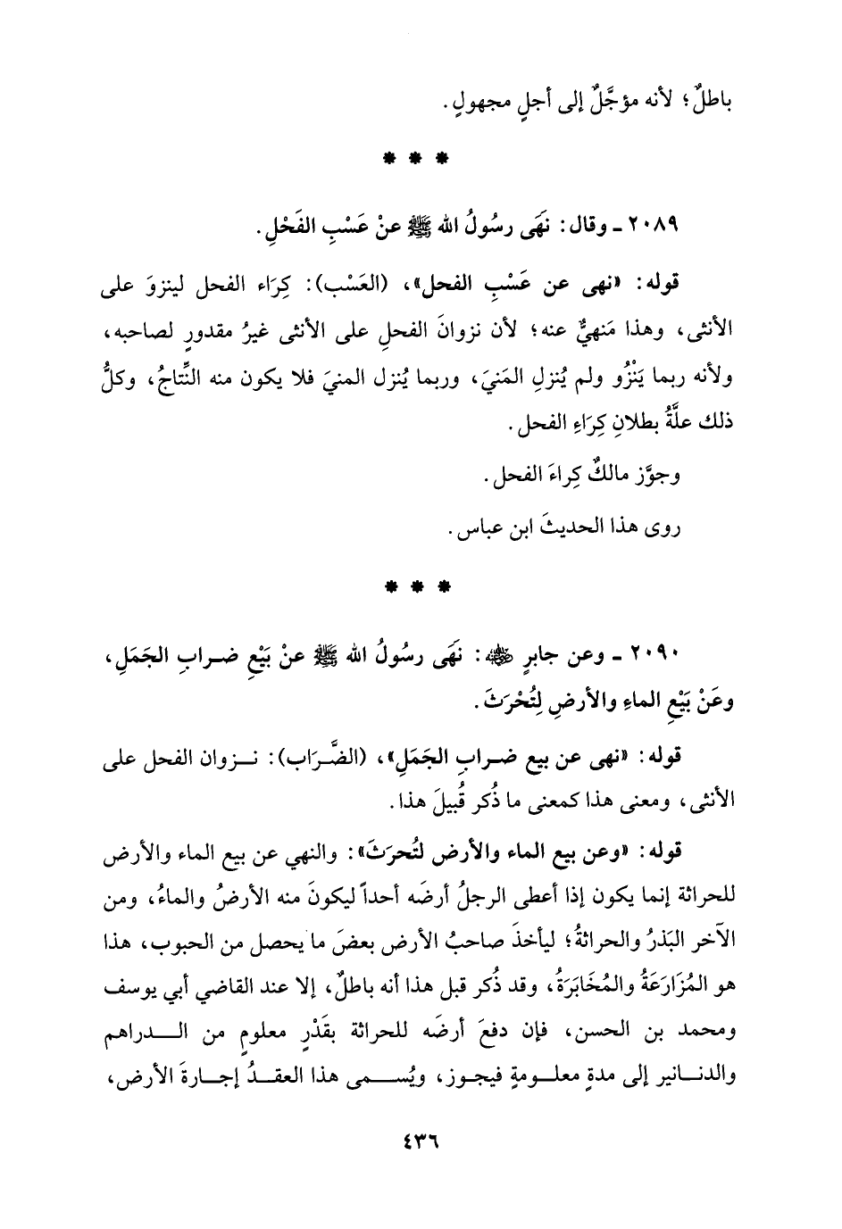 2090 - وعن جابرٍ - رضي الله عنه -: نَهَى رسُولُ الله - صلى الله عليه وسلم - عنْ بَيْعِ ضرابِ الجَمَلِ، وعَنْ بَيْعِ الماءِ والأرضِ لِتُحْرَثَ.