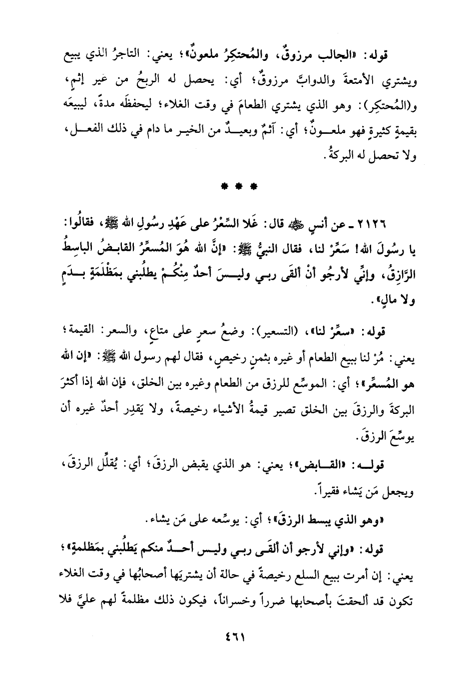 2126 - عن أنس - رضي الله عنه - قال: غَلا السِّعْرُ على عَهْدِ رسُولِ الله - صلى الله عليه وسلم -، فقالُوا: يا رسُولَ الله! سَعِّرْ لنا، فقال النبيُّ - صلى الله عليه وسلم -: "إنَّ الله هُوَ المُسعِّرُ القابضُ الباسِطُ الرَّازِقُ، وإنِّي لأرجُو أنْ ألقَى ربي وليسَ أحدٌ مِنْكُمْ يطلُبني بمَظْلَمَةٍ بدَمٍ ولا مالٍ".