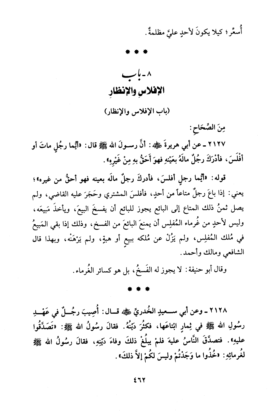 2127 - عن أبي هريرةَ - رضي الله عنه -: أنَّ رسولَ الله - صلى الله عليه وسلم - قال: "أيُّما رجُلٍ ماتَ أو أفْلَسَ، فأدْرَكَ رجُلٌ مالَهُ بعَيْنهِ فهوَ أَحَقُّ بهِ مِنْ غَيْرِهِ".