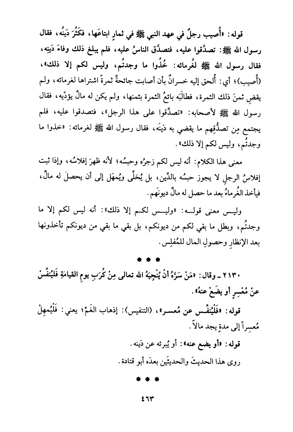 2130 - وقال: "مَنْ سَرَّهُ أنْ يُنْجيَهُ الله تعالى مِنْ كُرَبِ يومِ القيامَةِ فَليُنفِّسْ عنْ مُعْسِرٍ أو يضَعْ عنهُ".