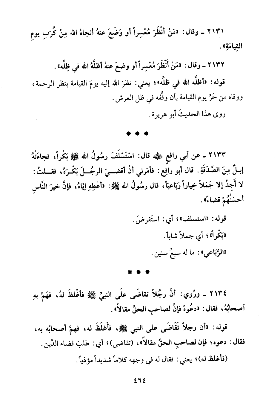2133 - عن أبي رافعٍ - رضي الله عنه - قال: اسْتَسْلَفَ رسُولُ الله - صلى الله عليه وسلم - بَكْرًا، فجاءَتْهُ إبلٌ مِنَ الصَّدَقَةِ. قال أبو رافِع: فأمَرني أنْ أقضيَ الرجُلَ بَكْرَهُ، فقلتُ: لا أَجِدُ إلا جَمَلًا خِيارًا رَبَاعيًّا، قال رسُولُ الله - صلى الله عليه وسلم -: "أعْطِهِ إيَّاهُ، فإنَّ خيرَ النَّاسِ أحسَنُهُمْ قضاءً".