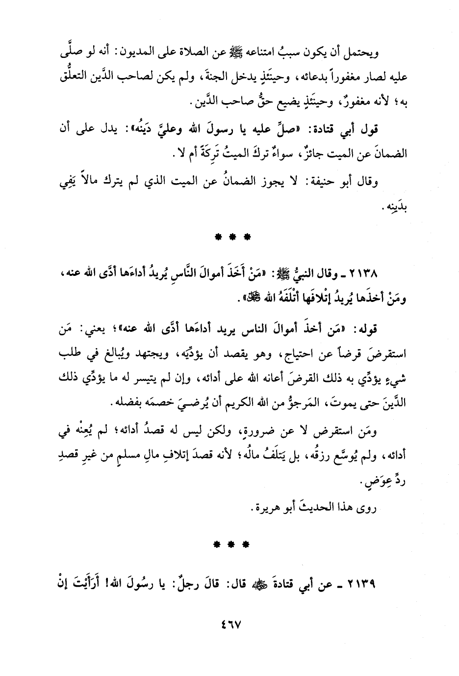 2138 - وقال النبيُّ - صلى الله عليه وسلم -: "مَنْ أَخَذَ أموالَ النَّاسِ يُريدُ أداءَها أدَّى الله عنه، ومَنْ أخذَها يُريدُ إتْلافَها أتْلَفَهُ الله - عز وجل -".