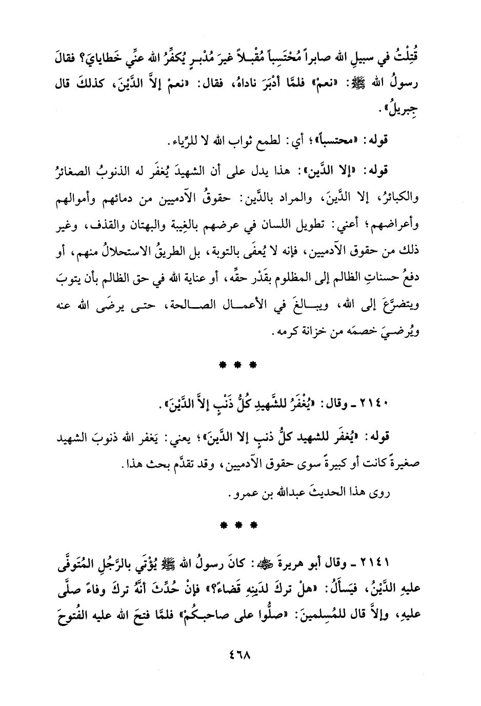 2140 - وقال: "يُغْفَرُ للشَّهيدِ كُلُّ ذَنْبٍ إلاَّ الدَّيْنَ".