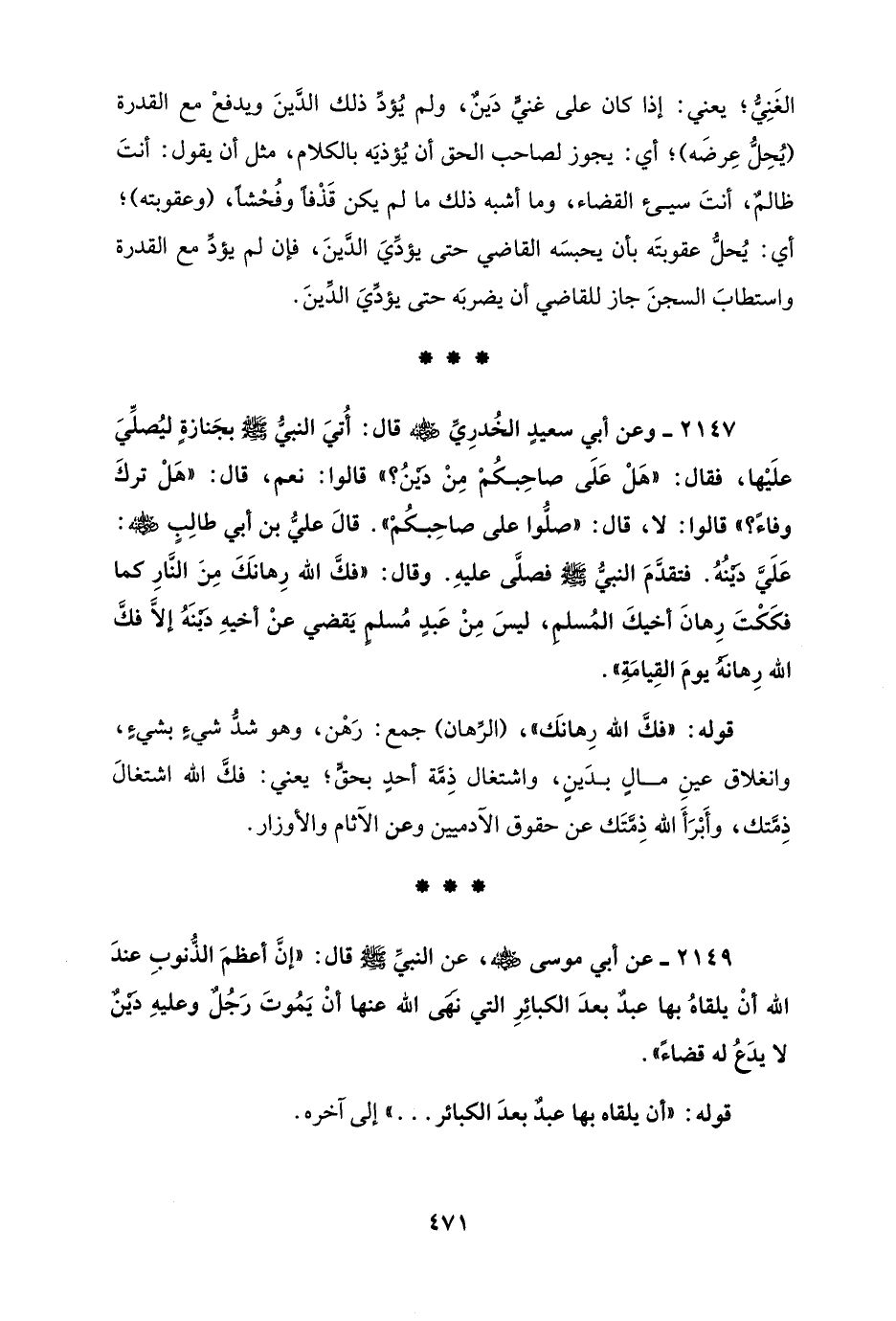 2147 - وعن أبي سعيدٍ الخُدرِيِّ - رضي الله عنه - قال: أُتيَ النبيُّ - صلى الله عليه وسلم - بجَنازةٍ ليُصلِّيَ علَيْها، فقال: "هَلْ عَلَى صاحِبكُمْ مِنْ دَيْنُ؟ " قالوا: نعم، قال: "هَلْ تركَ وفاءً؟ " قالوا: لا، قال: "صلُّوا على صاحِبكُمْ". قالَ عليُّ بن أبي طالِبٍ - رضي الله عنه -: عَلَيَّ دَيْنُهُ. فتقدَّمَ النبيُّ - صلى الله عليه وسلم - فصلَّى عليهِ. وقال: "فكَّ الله رِهانَكَ مِنَ النَّارِ كما فكَكْتَ رِهانَ أخيكَ المُسلمِ، ليسَ مِنْ عَبدٍ مُسلمٍ يَقضي عنْ أخيهِ دَيْنَهُ إلاَّ فكَّ الله رِهانَهُ يومَ القِيامَةِ".