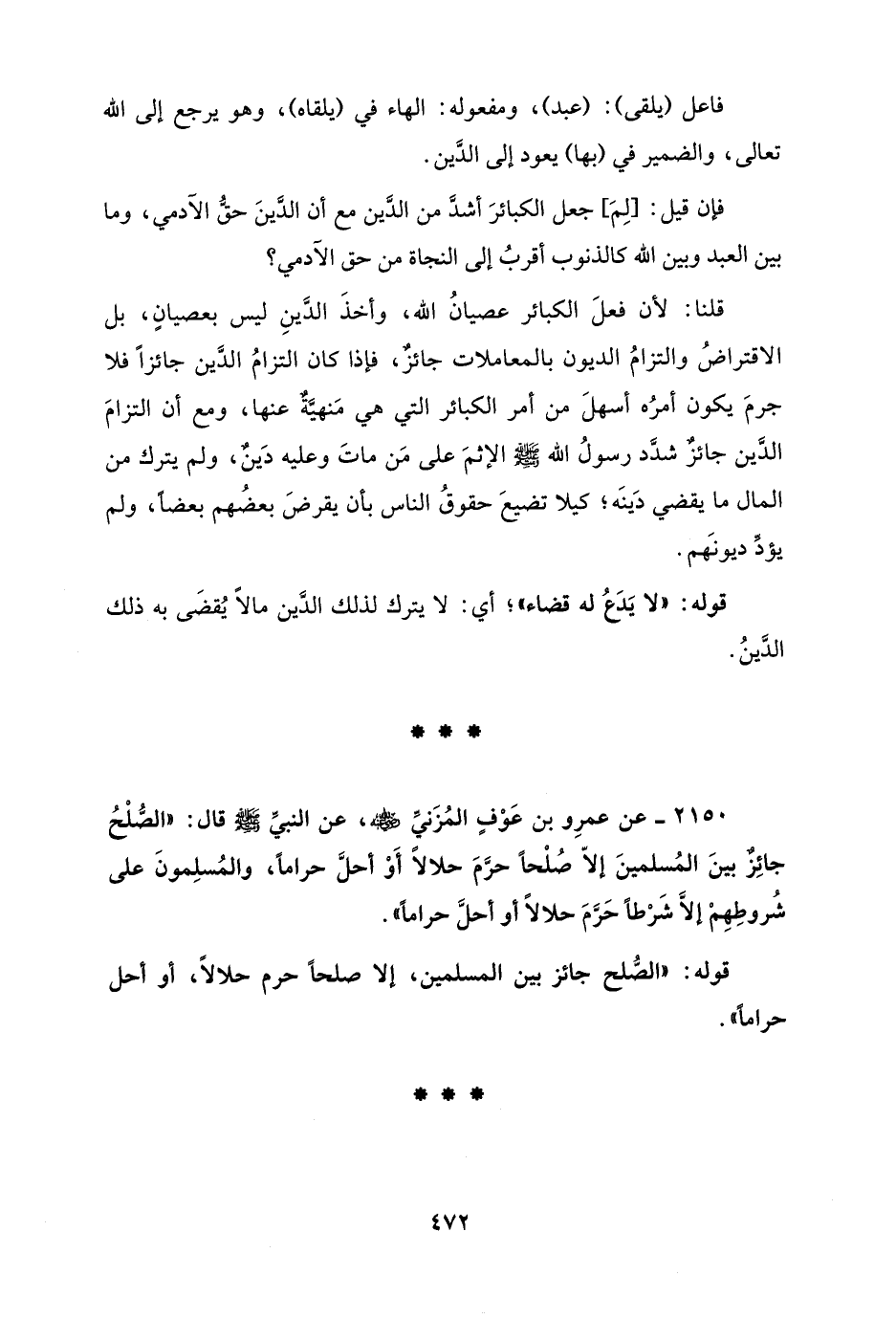 2150 - عن عمرِو بن عَوْفٍ المُزَنيِّ - رضي الله عنه -، عن النبيِّ - صلى الله عليه وسلم - قال: "الصُّلْحُ جائِزٌ بينَ المُسلمينَ إلّا صُلْحًا حرَّمَ حلالًا أَوْ أحلَّ حرامًا، والمُسلِمونَ على شُروطِهِمْ إلاَّ شَرْطًا حَرَّمَ حلالًا أو أحلَّ حرامًا".
