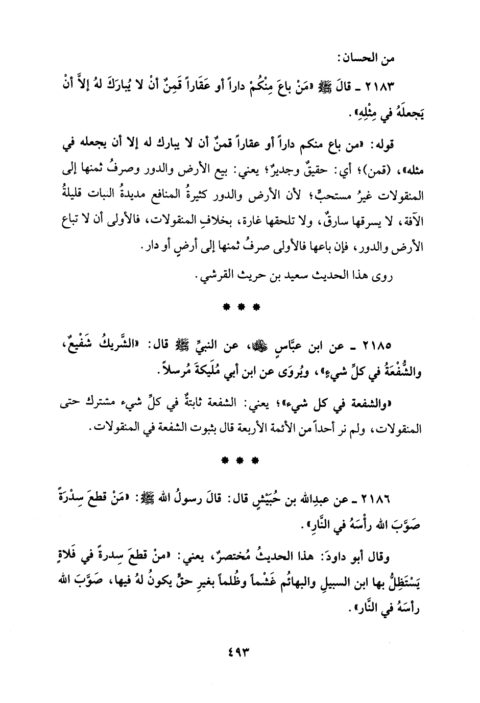 2185 - عن ابن عبَّاسٍ - رضي الله عنهما -، عن النبيَّ - صلى الله عليه وسلم - قال: "الشَّريكُ شَفْيعٌ، والشُّفْعَةُ في كلِّ شيءٍ"، ويُروَى عن ابن أبي مُلَيكةَ مُرسلًا.