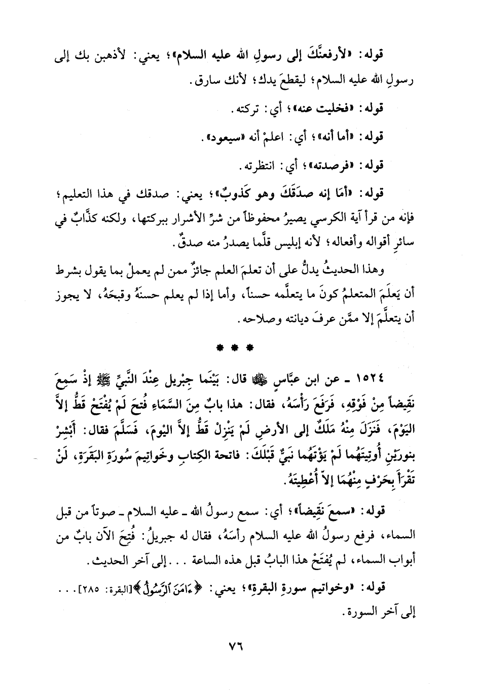 1524 - عن ابن عبَّاسٍ - رضي الله عنهما - قال: بَيْنَما جِبْريل عِنْدَ النَّبيِّ - صلى الله عليه وسلم - إذْ سَمِعَ نَقِيضًا مِنْ فَوْقِهِ، فَرَفَعَ رَأْسَهُ، فقال: هذا بابٌ مِنَ السَّمَاءِ فُتحَ لَمْ يُفْتَحْ قَطُّ إلَّا اليَوْمَ، فَنَزَلَ مِنْهُ مَلَكٌ إلى الأرضِ لَمْ يَنْزِلْ قَطُّ إلَّا اليْومَ، فَسَلَّمَ فقال: أَبْشِرْ بنورَيْنِ أُوتِيتَهُما لَمْ يَؤْتَهُما نَبيٌّ قَبْلَكَ: فاتحة الكِتابِ وخَواتِيمَ سُورَةِ البقَرَةِ، لَنْ تَقْرَأَ بِحَرْفٍ مِنْهُمَا إلاّ أُعْطِيتَهُ.