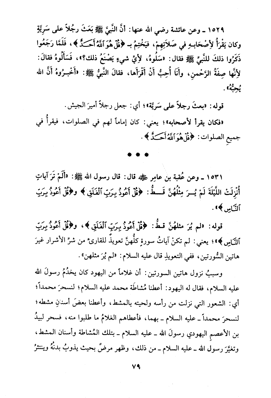 1529 - وعن عائشة رضي الله عنها: أنَّ النَّبيَّ - صلى الله عليه وسلم - بَعَثَ رجُلاً على سَرِيَّةٍ وكان يَقرَأُ لأِصْحَابهِ في صَلاَتِهِمْ، فيَخْتِمُ بـ {قُلْ هُوَ اللَّهُ أَحَدٌ}، فَلَمَّا رَجَعُوا ذَكَرُوا ذلكَ للنَّبيِّ - صلى الله عليه وسلم - فقال: "سَلُوهُ، لأِيَّ شيءٍ يَصْنَعُ ذلك؟ "، فَسَأَلوهُ فقالَ: لأِنَّها صِفَةُ الرَّحْمنِ، وأَناَ أُحِبُّ أَنْ أَقْرَأَها، فقالَ النبي - صلى الله عليه وسلم -: "أَخْبرُوهُ أَنَّ الله يُحِبُّهُ".