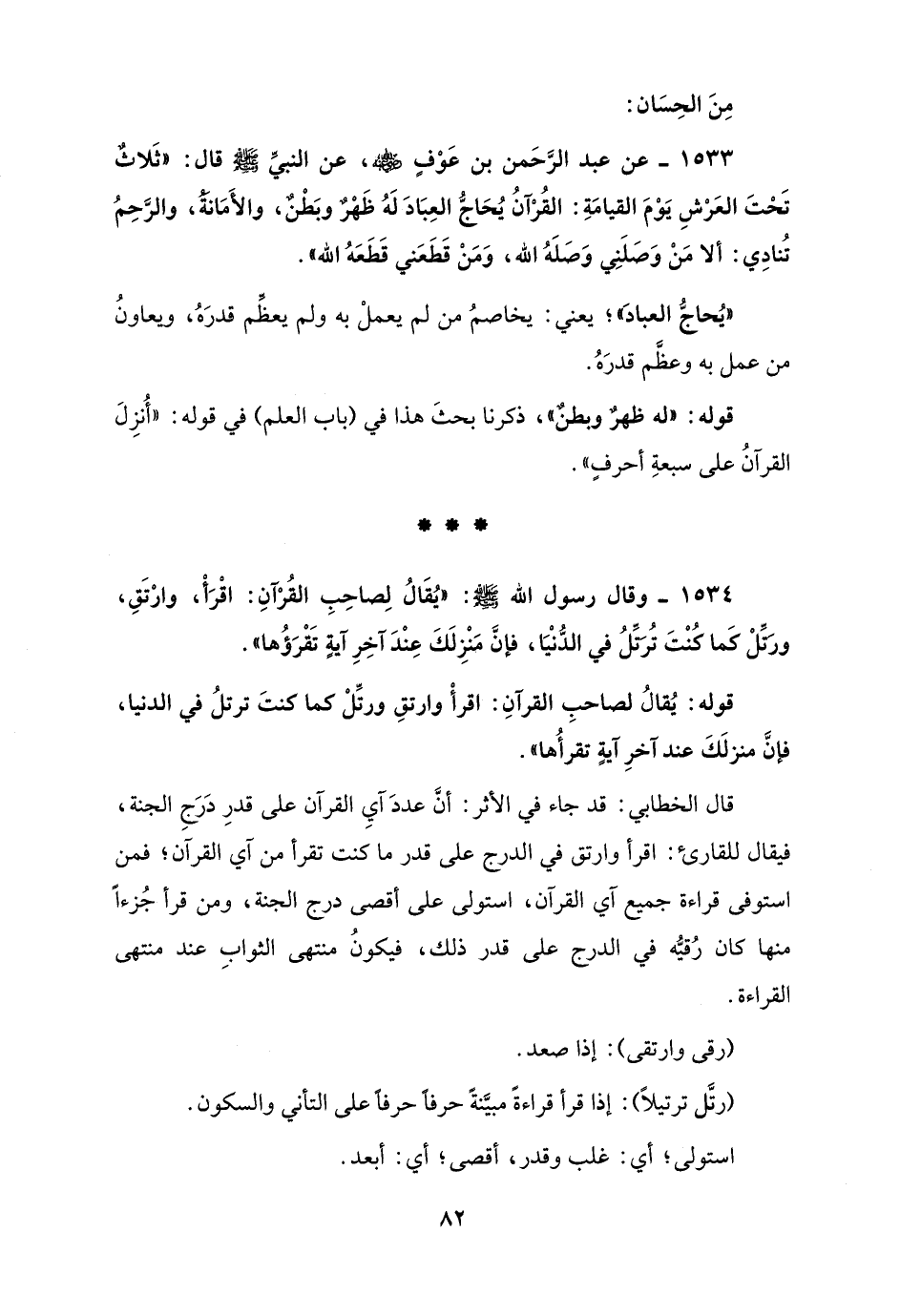 1534 - وقال رسول الله - صلى الله عليه وسلم -: "يُقَالُ لِصاحِبِ القُرْآنِ: اقْرَأْ، وارْتَقِ، ورَتَّلْ كَما كُنْتَ تُرَتَّلُ في الدُّنْيَا، فإنَّ مَنْزِلَكَ عِنْدَ آخِرِ آيةٍ تَقْرَؤُها".