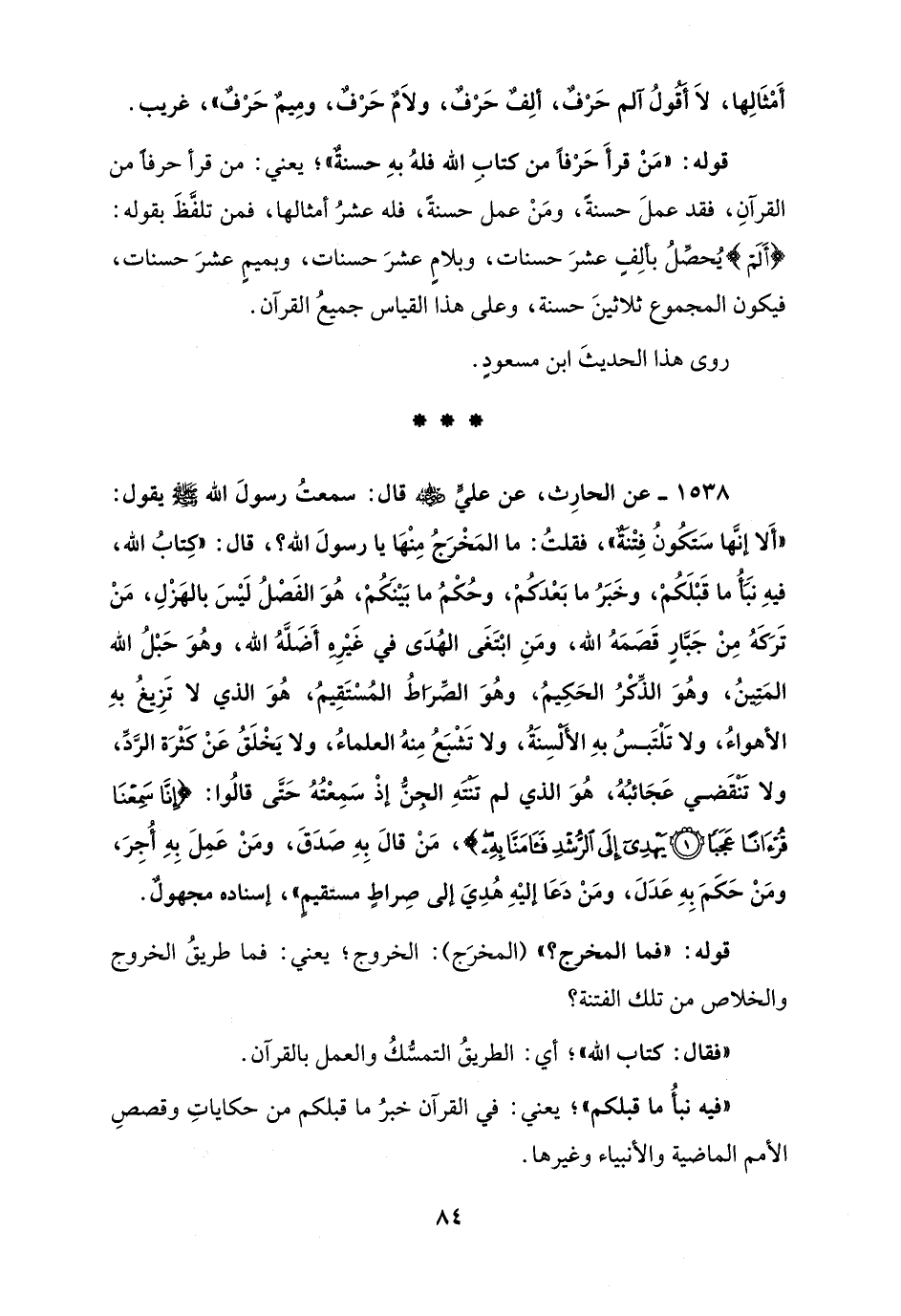 1538 - عن الحارِث، عن عليًّ - رضي الله عنه - قال: سمعتُ رسولَ الله - صلى الله عليه وسلم - يقول: "أَلا إنَّها سَتَكُونُ فِتْنَةٌ"، فقلتُ: ما المَخْرَجُ مِنْهَا يا رسولَ الله؟، قال: "كِتاب الله، فيهِ نَبَأُ ما قَبْلَكُمْ، وخَبَرُ ما بَعْدَكُمْ، وحُكْمُ ما بَيْنَكُمْ، هُوَ الفَصْلُ لَيْسَ بالهَزْلِ، مَنْ تَرَكَهُ مِنْ جَبَّارٍ قَصَمَهُ الله، ومَنِ ابْتَغَى الهُدَى في غَيْرِهِ أَضَلَّهُ الله، وهُوَ حَبْلُ الله المَتِينُ، وهُوَ الذِّكْرُ الحَكِيمُ، وهُوَ الصِّراطُ المُسْتَقِيمُ، هُوَ الذي لا تَزِيغُ بهِ الأهواءُ، ولا تَلْتَبسُ بهِ الأَلْسِنَةُ، ولا تَشْبَعُ مِنهُ العلماءُ، ولا يَخْلَقُ عَنْ كَثْرَة الرَّدِّ، ولا تَنْقَضي عَجَائبُهُ، هُوَ الذي لم تَنْتَهِ الجِنُّ إذْ سَمِعْتُهُ حَتَّى قالُوا: {إِنَّا سَمِعْنَا قُرْآنًا عَجَبًا (1) يَهْدِي إِلَى الرُّشْدِ فَآمَنَّا بِهِ}، مَنْ قالَ بِهِ صَدَقَ، ومَنْ عَمِلَ بِهِ أُجِرَ، ومَنْ حَكَمَ بِهِ عَدَلَ، ومَنْ دَعَا إليْهِ هُدِيَ إلى صِراطٍ مستقيمٍ"، إسناده مجهولٌ.