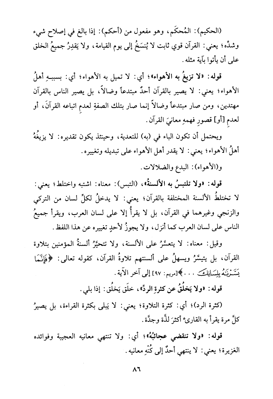 وقيل: معناه: لا يتعسَّرُ على الألسنة، ولا تتحيَّرُ ألسنةُ المؤمنين بتلاوة القرآن، بل يتيسَّرُ ويسهلُ على ألسنتهم تلاوةُ القرآن، كقوله تعالى: {فَإِنَّمَا يَسَّرْنَاهُ بِلِسَانِكَ ...} [مريم: 97] إلى آخر الآية.