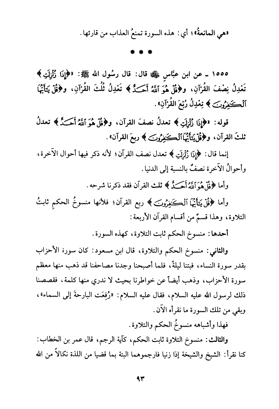 1555 - عن ابن عبَّاسٍ - رضي الله عنهما - قال: قال رسُول الله - صلى الله عليه وسلم -: {إِذَا زُلْزِلَتِ} تَعْدِلُ نِصْفَ القُرْآنِ، و {قُلْ هُوَ اللَّهُ أَحَدٌ} تَعْدِلُ ثُلُثَ القُرْآنِ، {قُلْ يَاأَيُّهَا الْكَافِرُونَ} تِعْدِلُ رُبْعَ القُرْآنِ".
