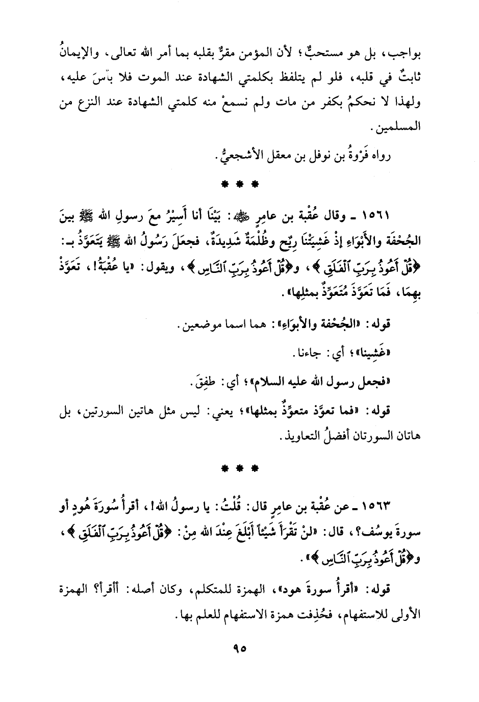 1561 - وقال عُقْبة بن عامِرٍ - رضي الله عنه -: بَيْنَا أنا أَسِيْرُ معَ رسولِ الله - صلى الله عليه وسلم - بينَ الجُحْفَة والأَبْوَاءِ إذْ غَشِيَتْنَا رِيحٌ وظُلْمَةٌ شَدِيدَةٌ، فجعَلَ رَسُولُ الله - صلى الله عليه وسلم - يتَعَوَّذُ بـ: {قُلْ أَعُوذُ بِرَبِّ الْفَلَقِ}، و {قُلْ أَعُوذُ بِرَبِّ النَّاسِ}، ويقول: "يا عُقبَةُ!، تَعَوَّذْ بهِمَا، فَمَا تَعَوَّذَ مُتَعَوِّذٌ بمثلِها".