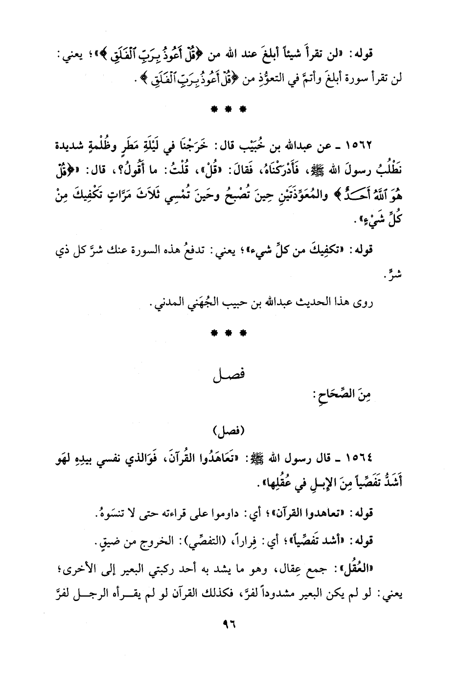 1562 - عن عبد الله بن خُبَيْب قال: خَرَجْنَا في لَيْلَةِ مَطَرٍ وظُلْمةٍ شديدة نَطْلُبُ رسولَ الله - صلى الله عليه وسلم -، فَأدْركْنَاهُ، فَقالَ: "قُلْ"، قُلْتُ: ما أقولُ؟، قال: " {قُلْ هُوَ اللَّهُ أَحَدٌ} والمُعَوِّذَتَيْنِ حِينَ تُصْبحُ وحَينَ تُمْسِي ثَلاَثَ مَرَّاتٍ تَكْفِيكَ مِنْ كُلِّ شَيْءٍ".