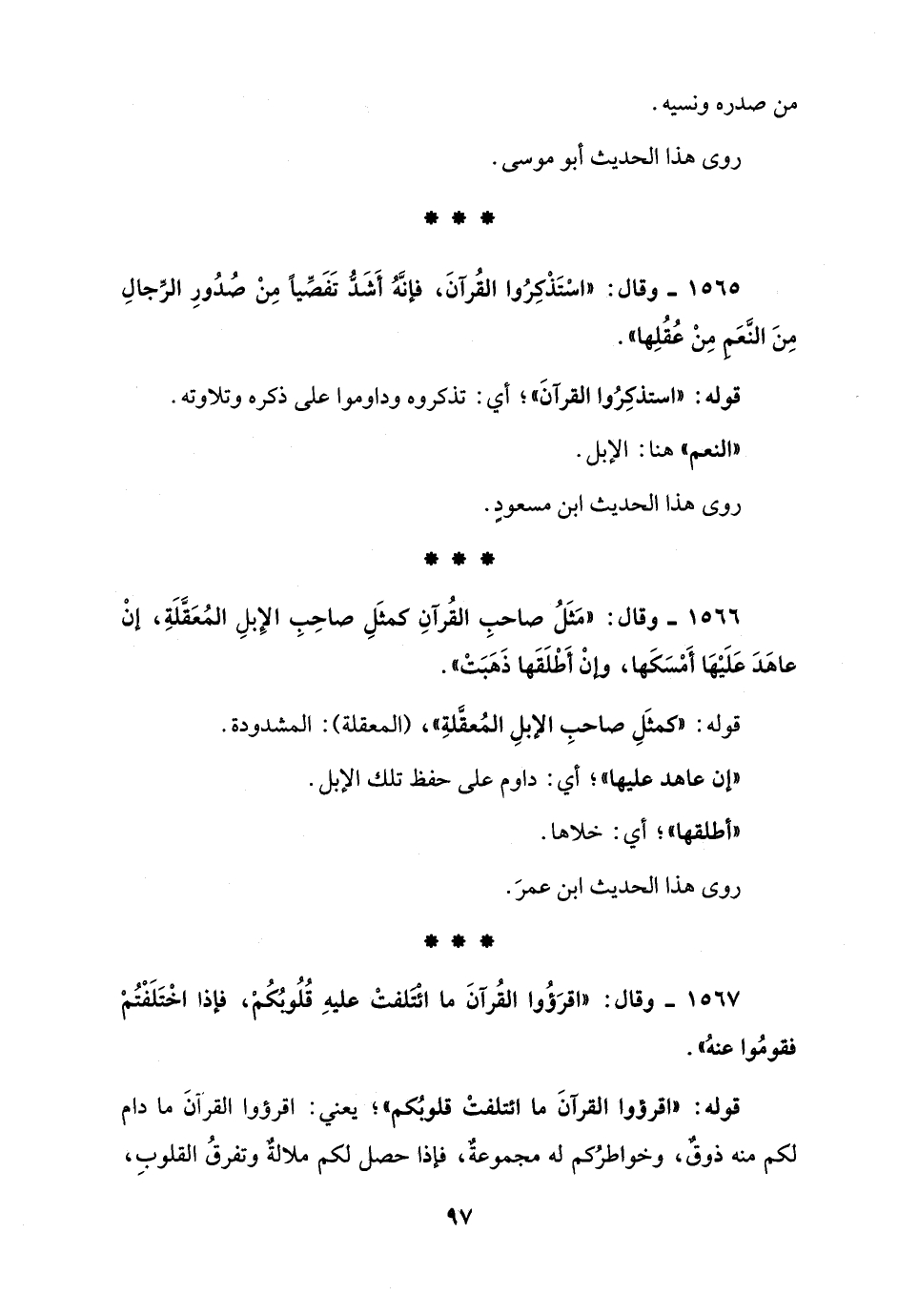 1565 - وقال: "اسْتَذْكِرُوا القُرآنَ، فإنَّهُ أَشَدُّ تَفَصِّيًا مِنْ صُدُورِ الرَّجالِ مِنَ النَّعَمِ مِنْ عُقُلِها".