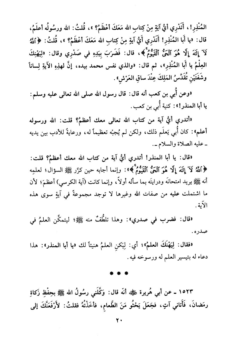المُنْذِرِ!، أَتَدْرِي أيُّ آيَةٍ مِنْ كِتابِ الله مَعَكَ أعْظَمُ؟ "، قُلتُ: الله ورسُولُه أعلَمُ، قال: "يا أَبا المُنْذِرِ! أَتَدْرِي أَيُّ آيةٍ مِنْ كتابِ الله مَعَكَ أعْظَمُ؟ "، قُلتُ: {اللَّهُ لَا إِلَهَ إِلَّا هُوَ الْحَيُّ الْقَيُّومُ}، قال: فَضَرَبَ بِيَدِهِ في صَدْرِي وقال: "لِيَهْنِكَ العِلْمُ يا أَبا المُنْذِرِ"، ثم قال: "والذي نفس محمد بيده، إنَّ لهذهِ الآيةِ لِسانًا وشَفَتَيْنِ تُقَدِّسُ المَلِكَ عِنْدَ ساقِ العَرْشِ".