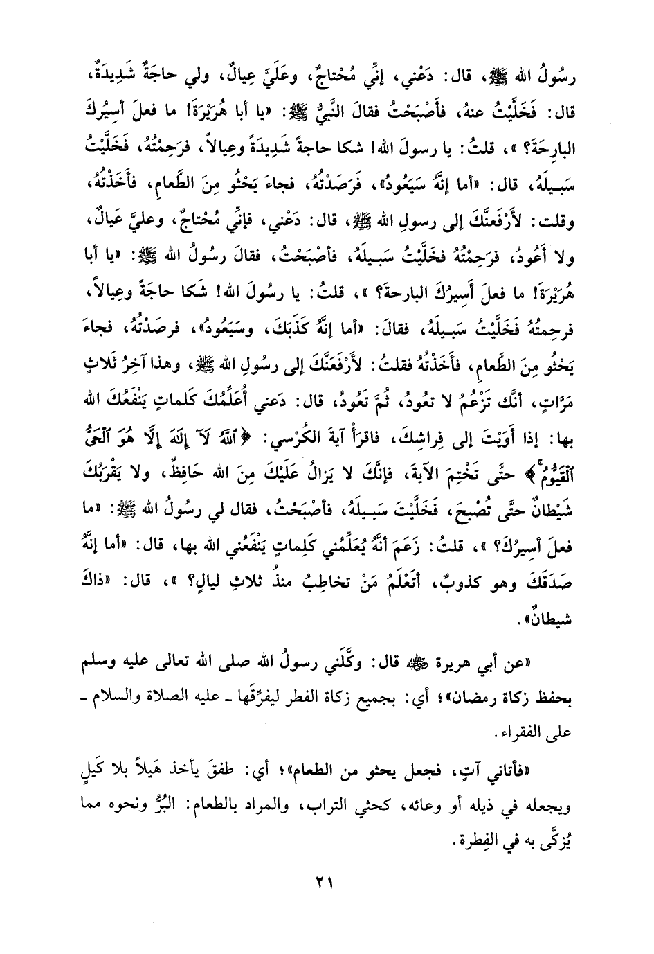 رسُولُ الله - صلى الله عليه وسلم -، قال: دَعْني، إنِّي مُحْتاجٌ، وعَلَيَّ عِيالٌ، ولي حاجَةٌ شَدِيدَةٌ، قال: فَخَلَّيْتُ عنهُ، فأَصْبَحْتُ فقالَ النَّبيّ - صلى الله عليه وسلم -: "يا أبا هُرَيْرَةَ! ما فعلَ أسِيُركَ البارِحَةَ؟ "، قلتُ: يا رسولَ الله! شكا حاجةً شَدِيدَةً وعِيالًا، فرَحِمْتُهُ، فَخَلَّيْتُ سَبيلَهُ، قال: "أما إنَّهُ سَيَعُودُ"، فَرَصَدْتُهُ، فجاءَ يَحْثُو مِنَ الطَّعامِ، فأَخَذْتُهُ، وقلت: لأَرْفَعنَّكَ إلى رسولِ الله - صلى الله عليه وسلم -، قال: دَعْني، فإنِّي مُحْتاجٌ، وعليَّ عَيالٌ، ولا أَعُودُ، فرَحِمْتُهُ فخَلَّيْتُ سَبيلَهُ، فأصْبَحْتُ، فقالَ رسُولُ الله - صلى الله عليه وسلم -: "يا أبا هُرَيْرَةَ! ما فعلَ أَسِيرُكَ البارحةَ؟ "، قلتُ: يا رسُولَ الله! شَكا حاجَةً وعِيالًا، فرحِمتُهُ فَخَلَّيْتُ سَبيلَهُ، فقالَ: "أما إنَّهُ كَذَبَكَ، وسَيَعُودُ"، فرصَدْتُهُ، فجاءَ يَحْثُو مِنَ الطَّعامِ، فأَخَذْتُهُ فقلتُ: لأَرْفَعَنَّكَ إلى رسُولِ الله - صلى الله عليه وسلم -، وهذا آخِرُ ثَلاثٍ مَرَّاتٍ، أنَّك تَزْعُمُ لا تعُودُ، ثُمَّ تَعُودُ، قال: دَعني أُعَلِّمُكَ كَلماتٍ يَنْفَعُكَ الله بها: إذا أَوَيْتَ إلى فِراشِكَ، فاقرَأْ آيةَ الكُرْسي: {اللَّهُ لَا إِلَهَ إِلَّا هُوَ الْحَيُّ الْقَيُّومُ} حتَّى تَخْتِمَ الآيةَ، فإنَّكَ لا يَزالُ عَلَيْكَ مِنَ الله حَافِظٌ، ولا يَقْرَبُكَ شَيْطانٌ حتَّى تُصْبحَ، فَخَلَّيْتَ سَبيلَهُ، فأصْبَحْتُ، فقال لي رسُولُ الله - صلى الله عليه وسلم -: "ما فعلَ أسِيرُكَ؟ "، قلتُ: زَعَمَ أنَّهُ يُعَلِّمُني كَلِماتٍ يَنْفَعُني الله بها، قال: "أما إنَّهُ صَدَقَكَ وهو كذوبٌ، أتَعْلَمُ مَنْ تخاطِبُ منذُ ثلاثِ ليالٍ؟ "، قال: "ذاكَ شيطانٌ".