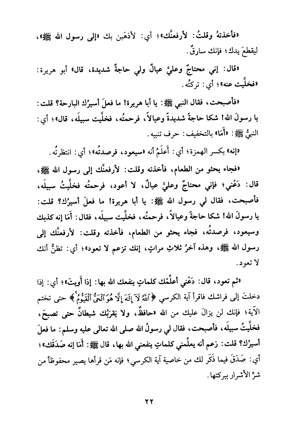 "فجاء يحثو من الطعام، فأخذته وقلت: لأرفعنَّك إلى رسول الله - صلى الله عليه وسلم -، قال: دَعْني؛ فإني محتاجٌ وعليَّ عيالٌ، لا أعود، فرحمتُه فخلَّيتُ سبيلَه، فأصبحت، فقال لي رسول الله - صلى الله عليه وسلم -: يا أبا هريرة! ما فعلَ أسيرُك؟ قلت: يا رسولَ الله! شكا حاجةً وعيالًا، فرحمتُه، فخلَّيت سبيلَه، فقال: أَمَا إنه كذبك وسيعود، فرصدتُه، فجاء يحثو من الطعام، فأخذته وقلت: لأرفعنَّك إلى رسول الله - صلى الله عليه وسلم -، وهذه آخرُ ثلاثِ مراتٍ، إنك تزعم لا تعود"، أي: تظنُّ أنك لا تعود.