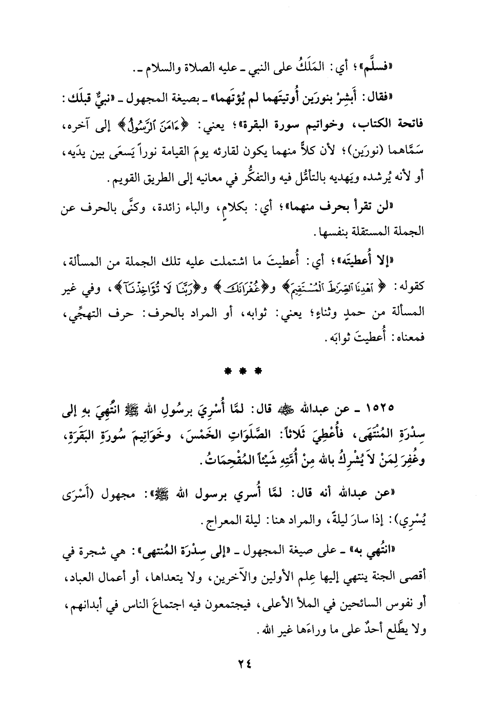 1525 - عن عبد الله - رضي الله عنه - قال: لمَّا أُسْرِيَ برسُولِ الله - صلى الله عليه وسلم - انتهِيَ بهِ إلى سِدْرَةِ المُنْتَهَى، فأُعْطِيَ ثَلاثًا: الصَّلَوَاتِ الخَمْسَ، وخَوَاتِيمَ سُورَةِ البَقَرَةِ، وغُفِرَ لِمَنْ لَا يُشْرِكُ بالله مِنْ أُمَّتِهِ شَيْئًا المُقْحِمَاتُ.