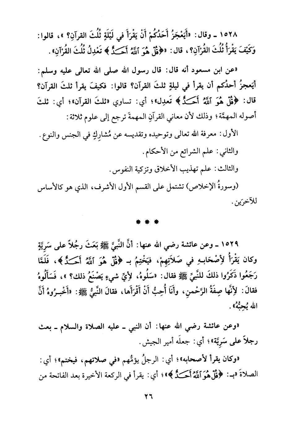 "عن ابن مسعود أنَّه قال: قال رسول الله صلى الله تعالى عليه وسلم: أيَعجزُ أحدكم أن يقرأ في ليلةٍ ثلثَ القرآن؟ قالوا: فكيفَ يقرأ ثلثَ القرآن؟ قال: {قُلْ هُوَ اللهُ أَحَدٌ} تَعدِل؛ أي: تساوي "ثلثَ القرآن"؛ أي: ثلثَ أصوله المهمَّة؛ وذلك لأن معاني القرآن المهمةَ ترجع إلى علوم ثلاثة: