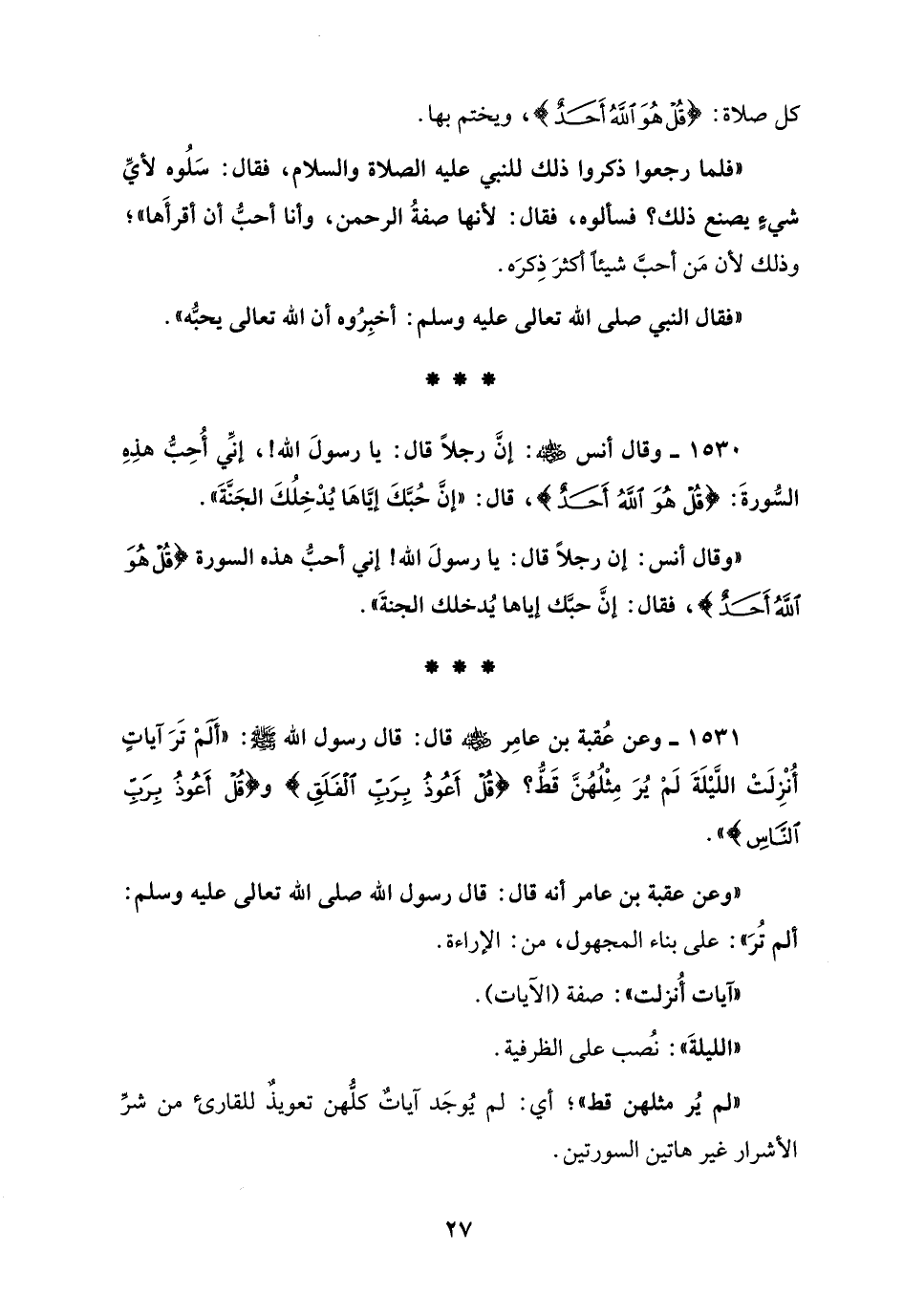 1530 - وقال أنس - رضي الله عنه -: إنَّ رجلًا قال: يا رسولَ الله!، إنِّي أُحِبُّ هذِهِ السُّورةَ: {قُلْ هُوَ اللهُ أَحَدٌ}، قال: "إنَّ حُبَّكَ إيَّاهَا يُدْخِلُكَ الجَنَّةَ".